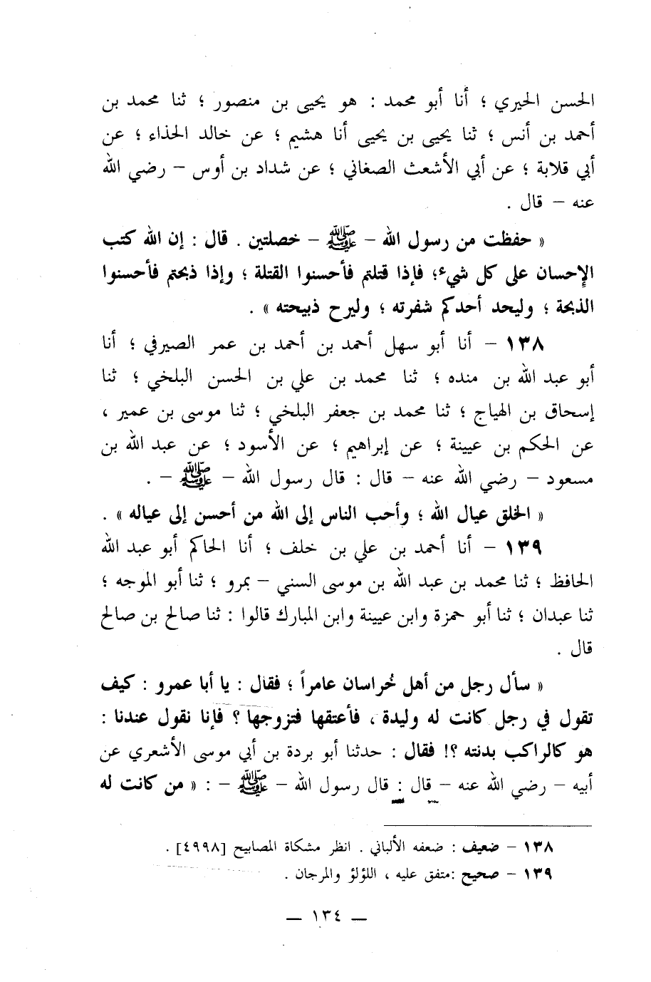 139- أنا أحمد بن علي بن خلف؛ أنا الحاكم أبو عبد الله الحافظ؛ ثنا محمد بن عبد الله بن موسى السني –بمرو؛ ثنا أبو الموجه؛ ثنا عبدان؛ ثنا أبو حمزة وابن عيينة وابن المبارك قالوا: ثنا صالح بن صالح قال: