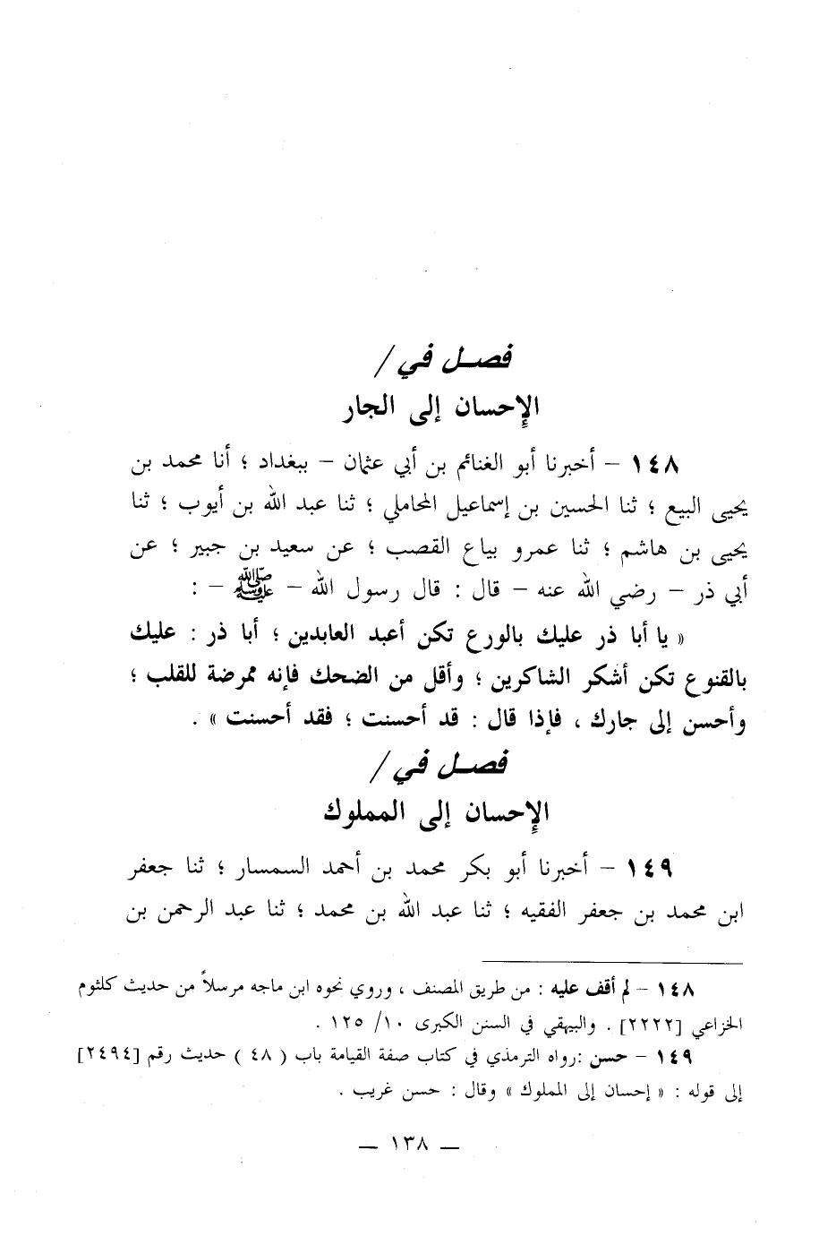 148- أخبرنا أبو الغنائم بن أبي عثمان – ببغداد؛ أنا محمد بن يحيى البيع؛ ثنا الحسين بن إسماعيل المحاملي؛ ثنا عبد الله بن أيوب؛ ثنا يحيى بن هاشم؛ ثنا عمرو بياع القصب؛ عن سعيد بن جير؛ عن أبي ذر –رضي الله عنه- قال: قال رسول الله صلى الله عليه وسلم: