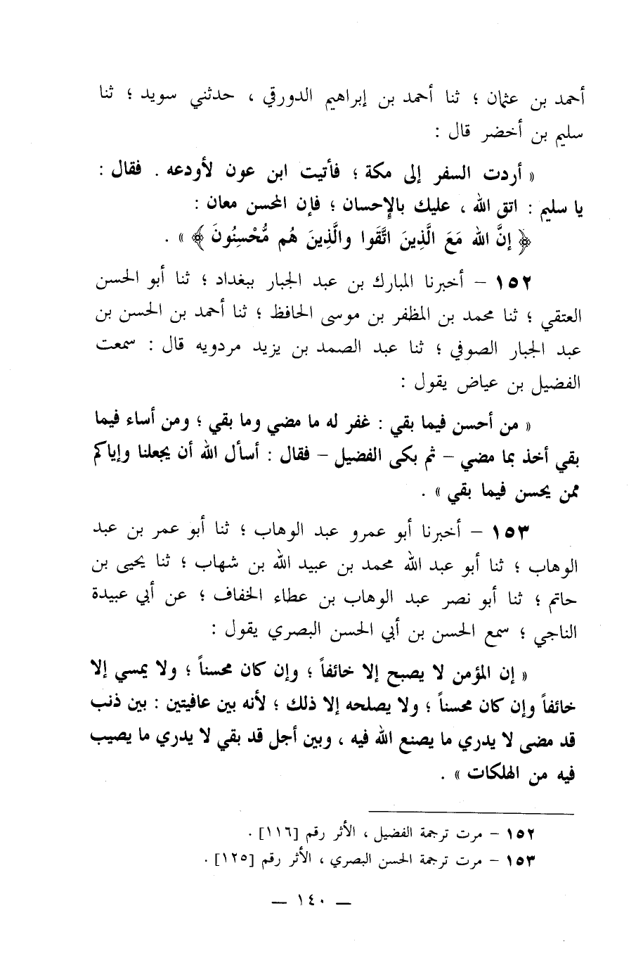 152- أخبرنا المبارك بن عبد الجبار ببغداد؛ ثنا أبو الحسن العتقي؛ ثنا محمد بن المظفر بن موسى الحافظ؛ ثنا أحمد بن الحسن بن عبد الجبار الصوفي؛ ثنا عبد الصمد بن يزيد مردويه قال: سمعت الفضيل بن عياض يقول: