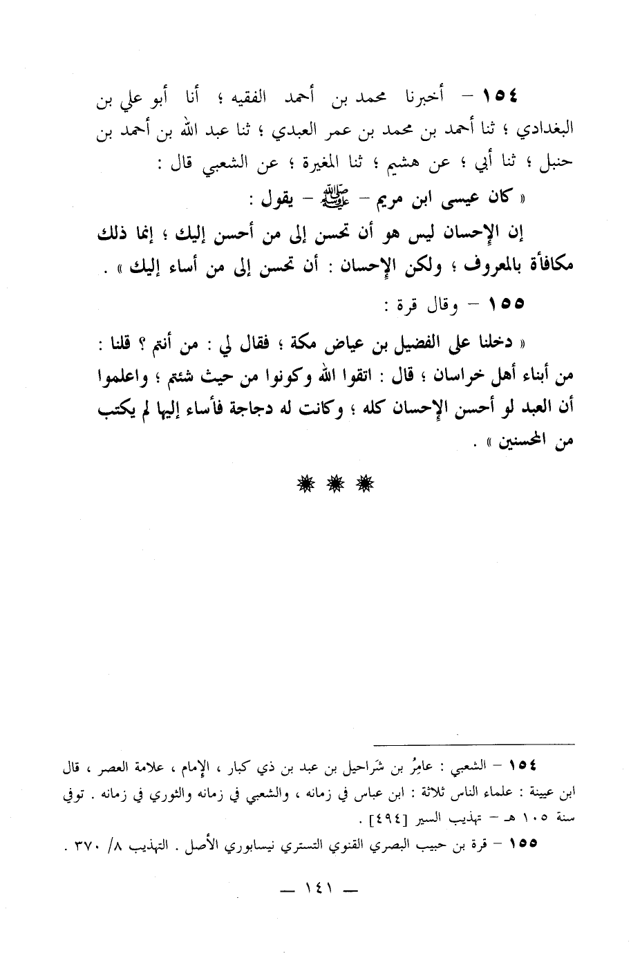 154- أخبرنا محمد بن أحمد الفقيه؛ أنا أبو علي بن البغدادي؛ ثنا أحمد بن محمد بن عمر العبدي؛ ثنا عبد الله بن أحمد بن حنبل؛ ثنا أبي؛ عن هشيم؛ ثنا المغيرة؛ عن الشعبي قال:
