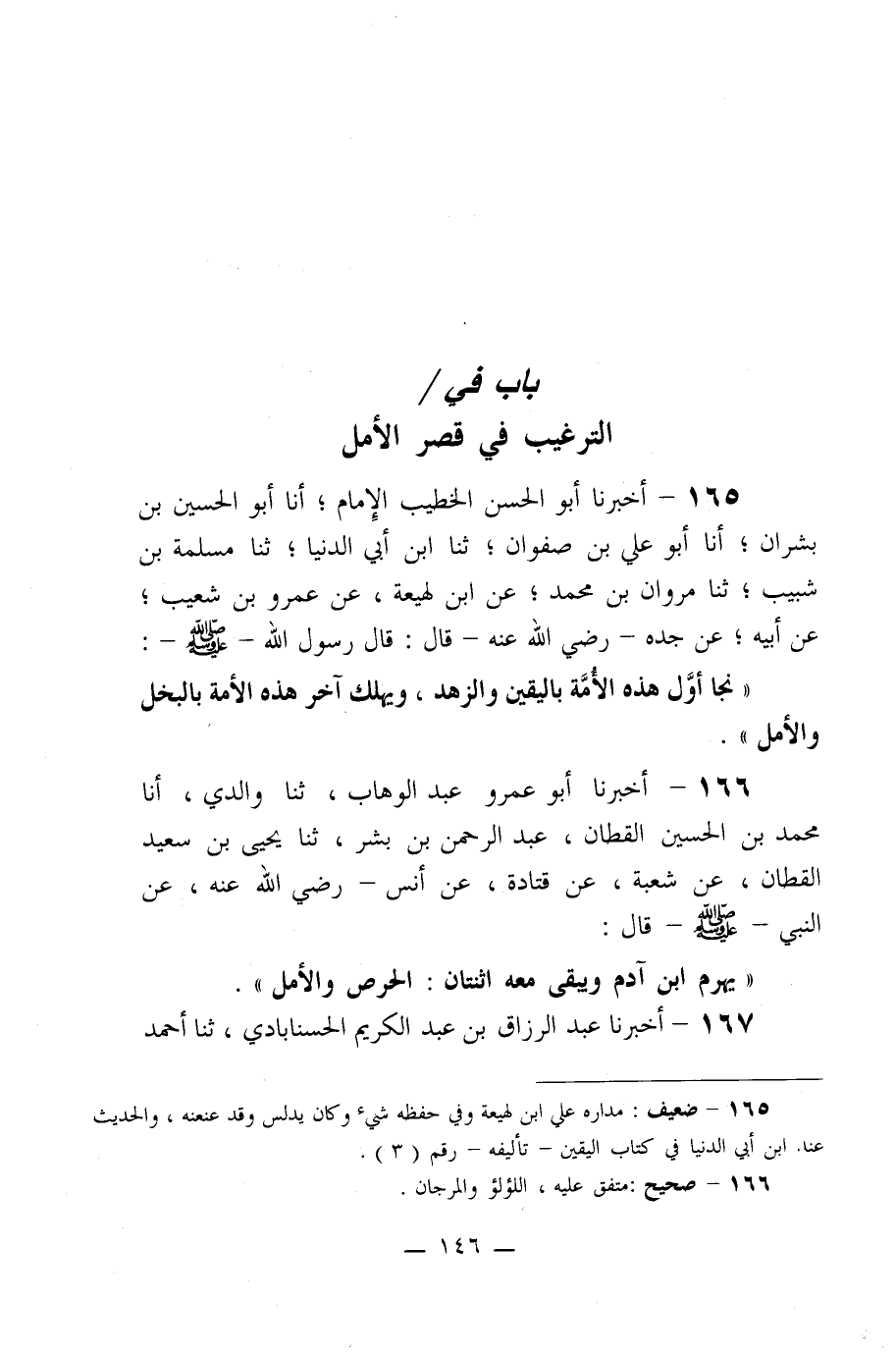 165- أخبرنا أبو الحسن الخطيب الإمام؛ أنا أبو الحسين بن بشران؛ أنا أبو علي بن صفوان؛ ثنا ابن أبي الدنيا؛ ثنا مسلمة بن شبيب؛ ثنا مروان بن محمد؛ عن ابن لهيعة، عن عمرو بن شعيب؛ عن أبيه؛ عن جده –رضي الله عنه- قال: قال رسول الله صلى الله عليه وسلم: