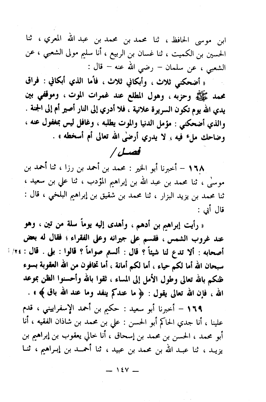 169- أخبرنا أبو سعيد: حكيم بن أحمد الإسفراييني، قدم علينا، أنا جدي الحاكم أبو الحسن: علي بن محمد بن شاذان الفقيه، أنا أبو محمد، الحسن بن محمد بن إسحاق، أنا خالي يعقوب بن إبراهيم بن يزيد، ثنا عبد الله بن محمد بن عبيد، ثنا أحمد بن إبراهيم، ثنا -[148]- السري بن يوسف الأنصاري، عن محمد بن أبي توبة قال: