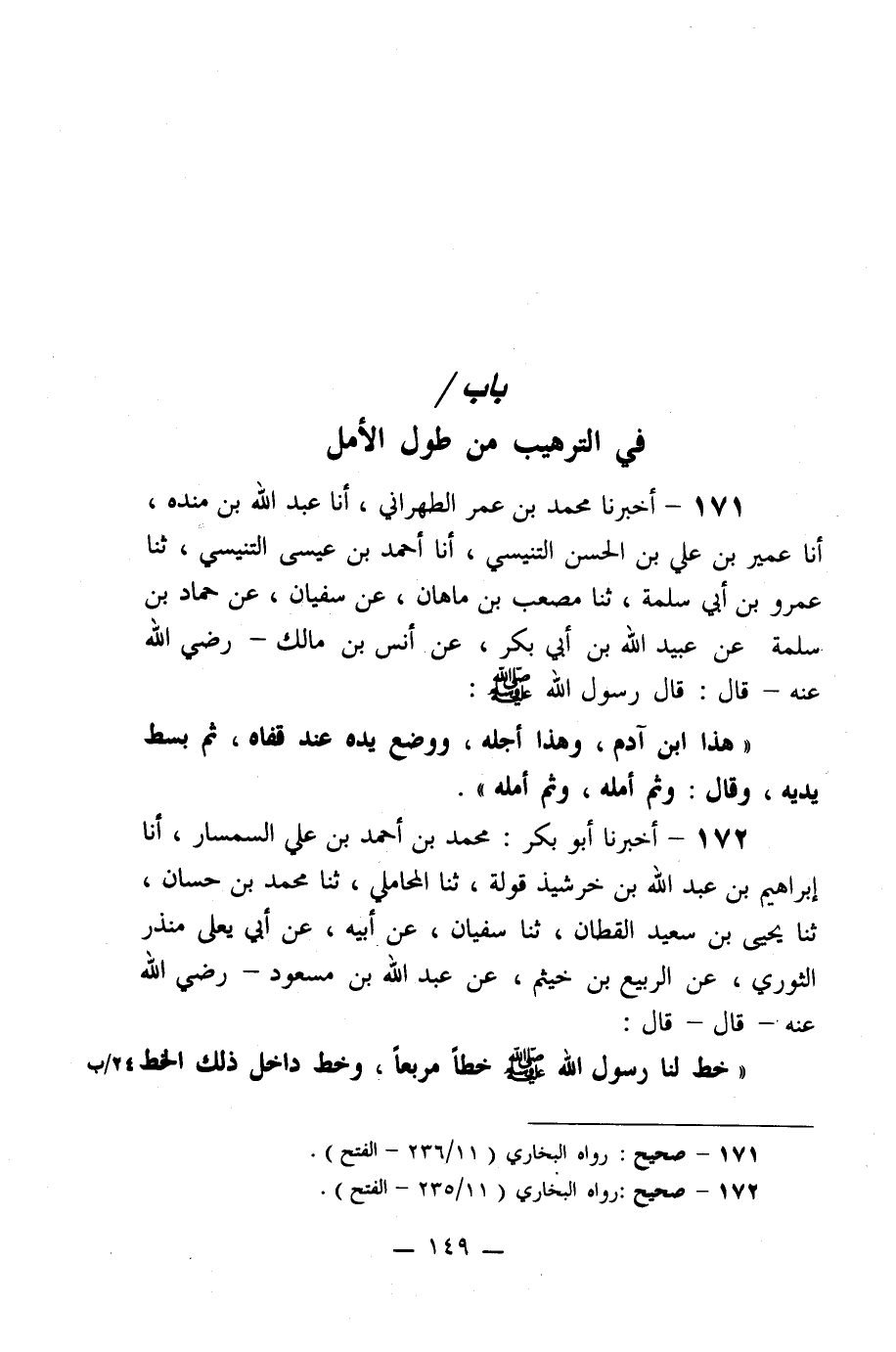 ((خط لنا رسول الله صلى الله عليه وسلم خطاً مربعاً، وخط داخل ذلك الخط -[150]- المربع خطأ، وخط إلى جانب ذلك الخط خطوطاً، وخط خارج ذلك الخط المربع خطاً، ثم قال: هذا الخط المربع ابن آدم، وهذا الخط الذي داخل الخط المربع أجله. هذه الخطوط إلى جانب الخط الأعراض إن أخطأته هذه نهشته هذه، والخط الخارج أمله)) .