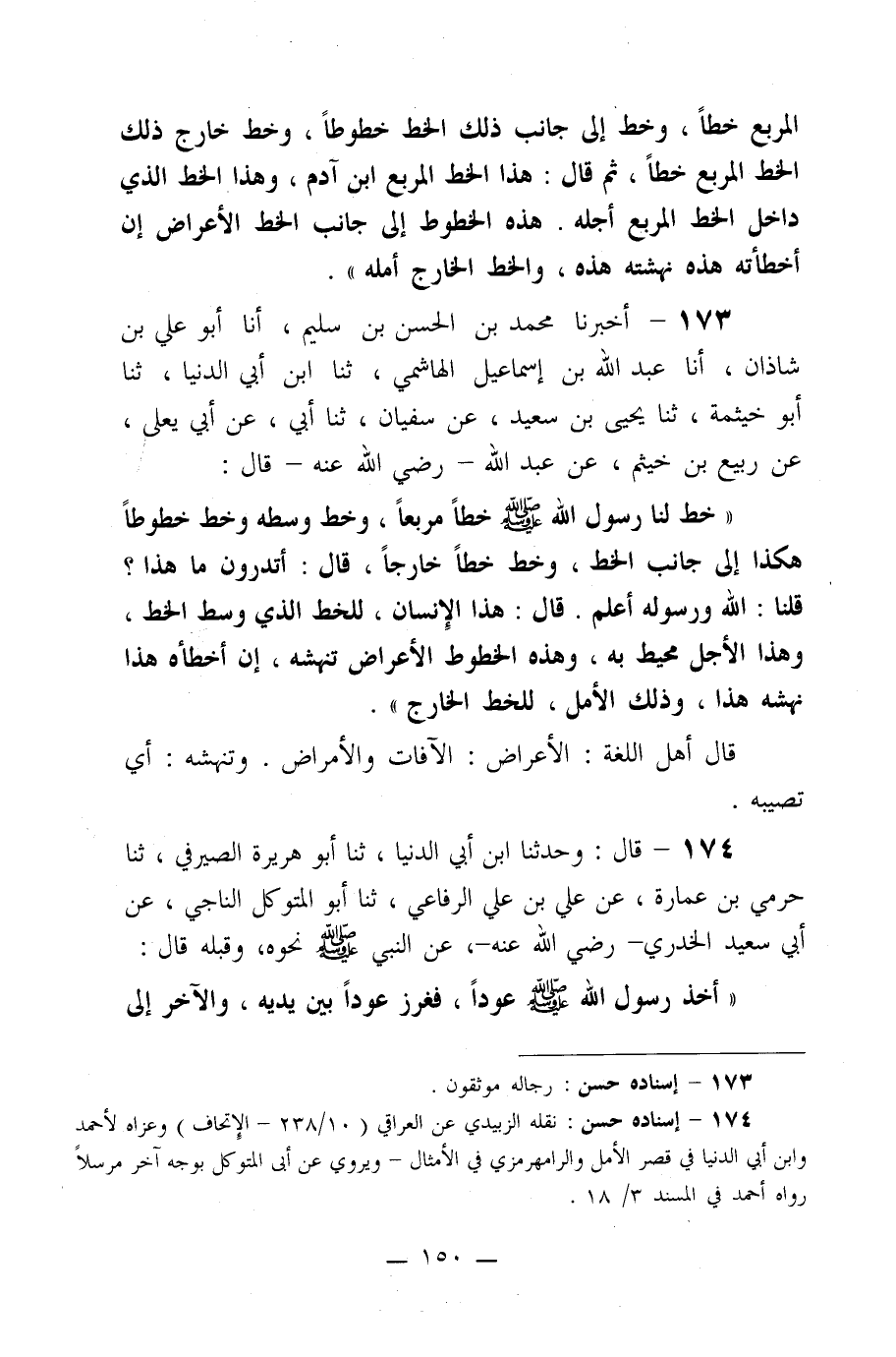 ((خط لنا رسول الله صلى الله عليه وسلم خطاً مربعاً، وخط وسطه وخط خطوطاً هكذا إلى جانب الخط، وخط خطاً خارجاً، قال: أتدرن ما هذا؟ قلنا: الله ورسوله أعلم. قال: هذا الإنسان، للخط الذي وسط الخط، وهذا الأجل محيط به، وهذه الخطوط الأعراض تنهشه، إن أخطأه هذا نهشه هذا، وذلك الأمل، للخط الخارج)) .