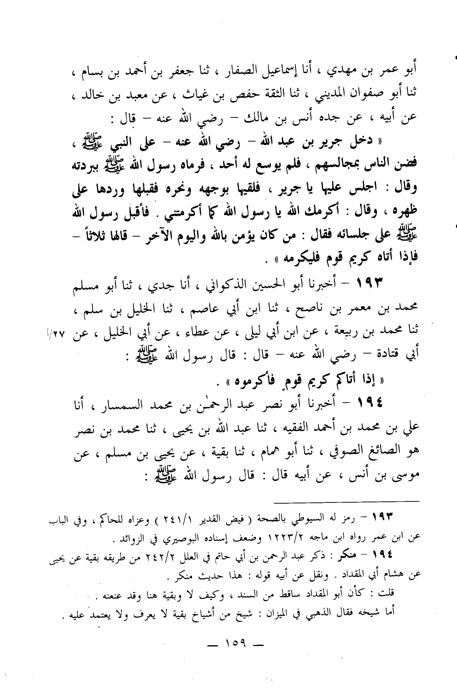 194- أخبرنا أبو نصر عبد الرحمن بن محمد السمسار، أنا علي بن محمد بن أحمد الفقيه، ثنا عبد الله بن يحيى، ثنا محمد بن نصر هو الصائغ الصوفي، ثنا أبو همام، ثنا بقية، عن يحيى بن مسلم، عن موسى بن أنس، عن أبيه قال: قال رسول الله صلى الله عليه وسلم: