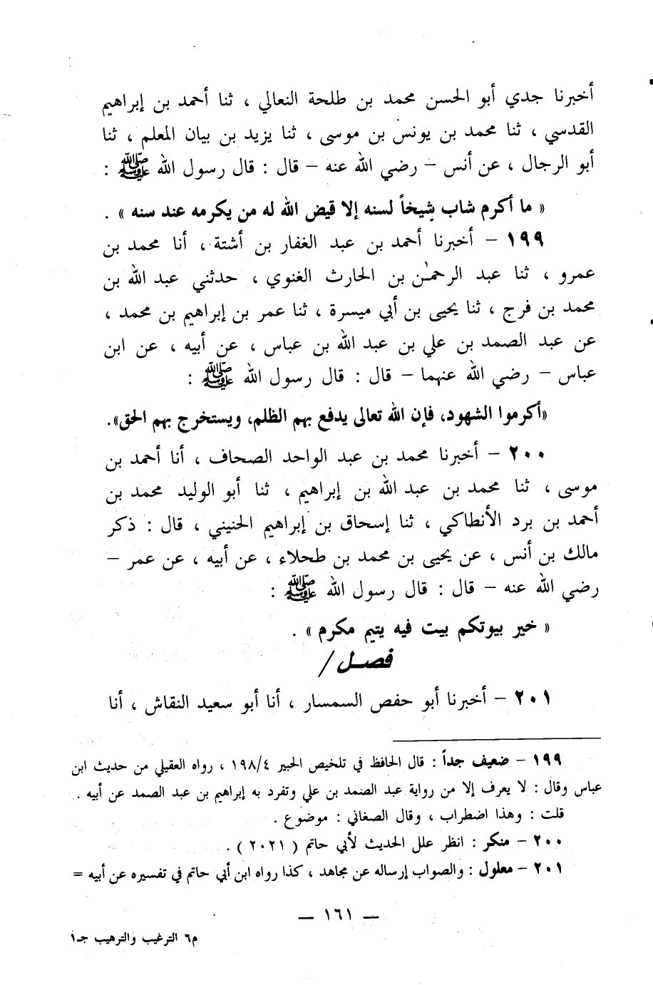 199- أخبرنا أحمد بن عبد الغفار بن أشتة، أنا محمد بن عمرو، ثنا عبد الرحمن بن الحارث الغنوي، حدثني عبد الله بن محمد بن فرج، ثنا يحيى بن أبي ميسرة، ثنا عمر بن إبراهيم بن محمد، عن عبد الصمد بن علي بن عبد الله بن عباس، عن أبيه، عن ابن عباس –رضي الله عنهما- قال: قال رسول الله صلى الله عليه وسلم: