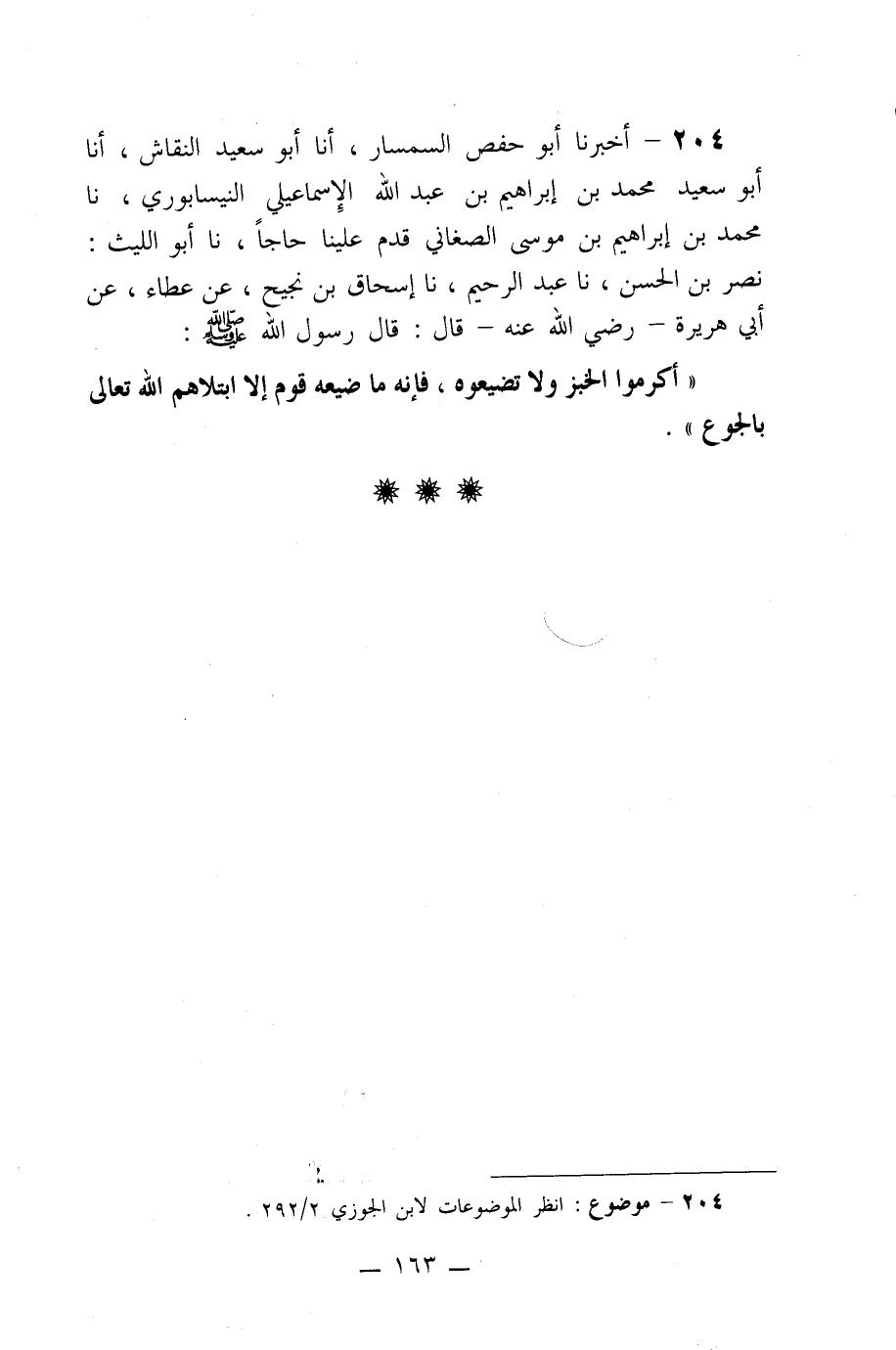 204- أخبرنا أبو حفص السمسار، أنا أبو سعيد النقاش، أنا أبو سعيد محمد بن إبراهيم بن عبد الله الإسماعيلي النيسابوري، نا محمد بن إبراهيم بن موسى الصغاني قدم علينا حاجاً، نا أبو الليث: نصر بن الحسن، نا عبد الرحيم، نا إسحاق بن نجيح، عن عطاء، عن أبي هريرة –رضي الله عنه- قال: قال رسول الله صلى الله عليه وسلم: