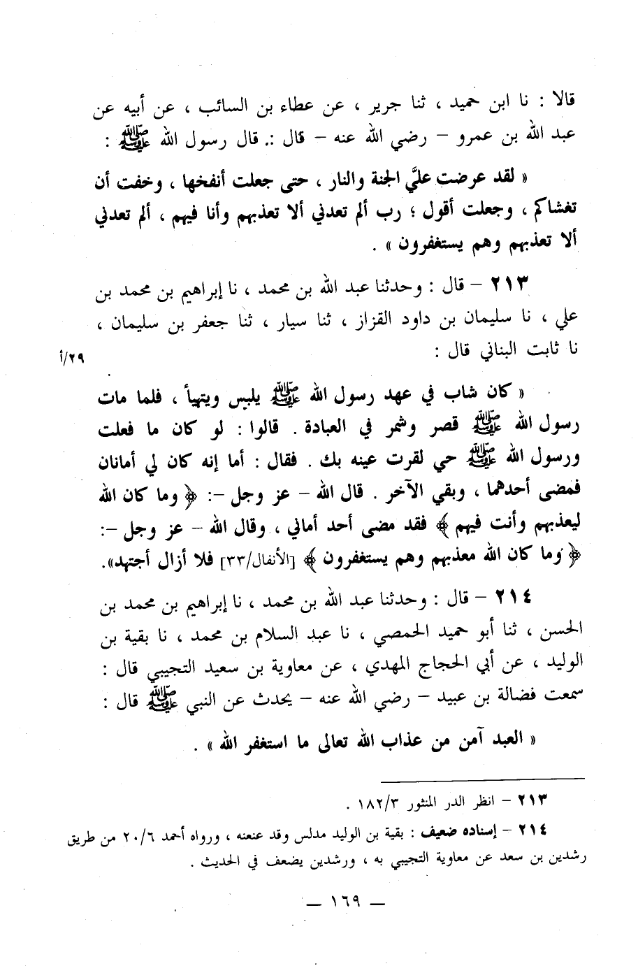 214- قال: وحدثنا عبد الله بن محمد، نا إبراهيم بن محمد بن الحسن، ثنا أبو حميد الحمصي، نا عبد السلام بن محمد، نا بقية بن الوليد، عن أبي الحجاج المهدي، عن معاوية بن سعيد التجيبي قال: سمعت فضالة بن عبيد –رضي الله عنه- يحدث عن النبي صلى الله عليه وسلم قال: