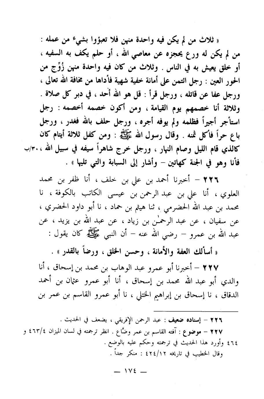 226- أخبرنا أحمد بن علي بن خلف، أنا ظفر بن محمد العلوي، أنا علي بن عبد الرحمن بن عيسى الكاتب بالكوفة، نا محمد بن عبد الله الحضرمي، ثنا هيثم بن حماد، نا أبو داود الحفري، عن سفيان، عن عبد الرحمن بن زياد، عن عبد الله بن يزيد، عن عبد الله بن عمرو –رضي الله عنه- أن النبي صلى الله عليه وسلم كان يقول: