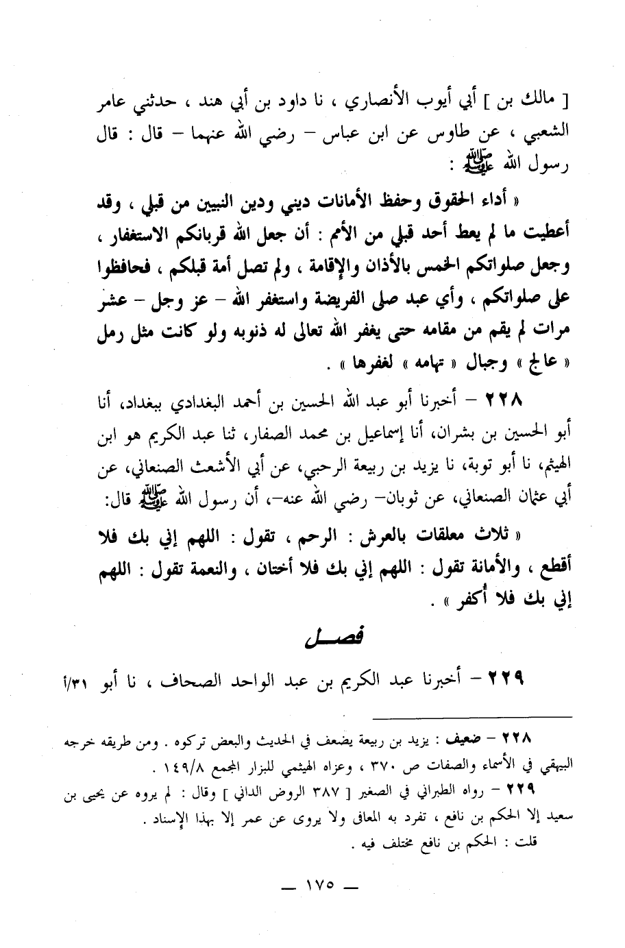 228- أخبرنا أبو عبد الله الحسين بن أحمد البغدادي ببغداد، أنا أبو الحسين بن بشران، أنا إسماعيل بن محمد الصفار، ثنا عبد الكريم هو ابن الهيثم، نا أبو توبة، نا يزيد بن ربيعة الرحبي، عن أبي الأشعث الصنعاني، عن أبي عثمان الصنعاني، عن ثوبان –رضي الله عنه-، أن رسول الله صلى الله عليه وسلم قال: