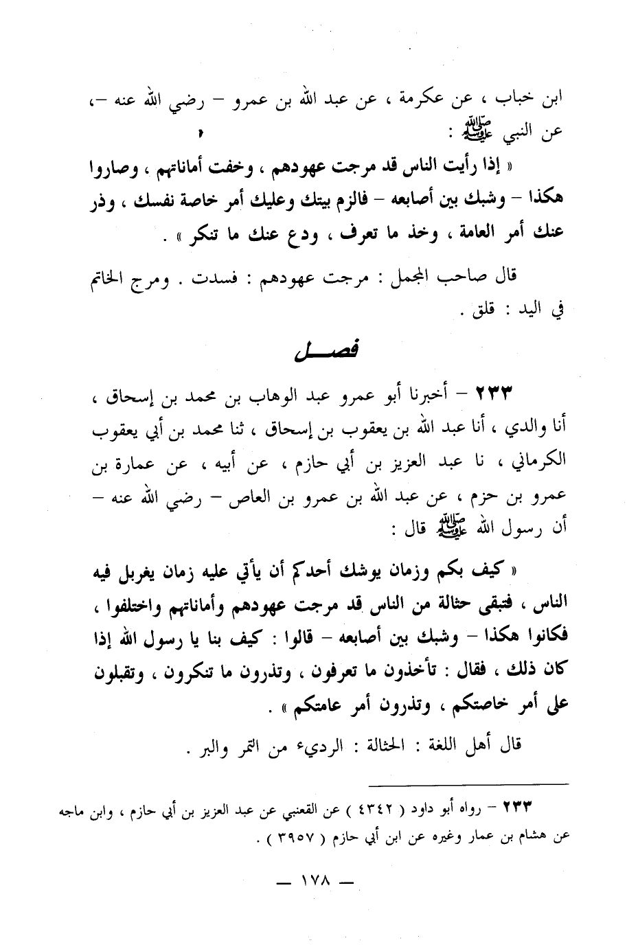 233- أخبرنا أبو عمرو عبد الوهاب بن محمد بن إسحاق، أنا والدي، أنا عبد الله بن يعقوب بن إسحاق، ثنا محمد بن أبي يعقوب الكرماني، نا عبد العزيز بن أبي حازم، عن أبيه، عن عمارة بن عمرو بن حزم، عن عبد الله بن عمرو بن العاص –رضي الله عنه- أن رسول الله صلى الله عليه وسلم قال: