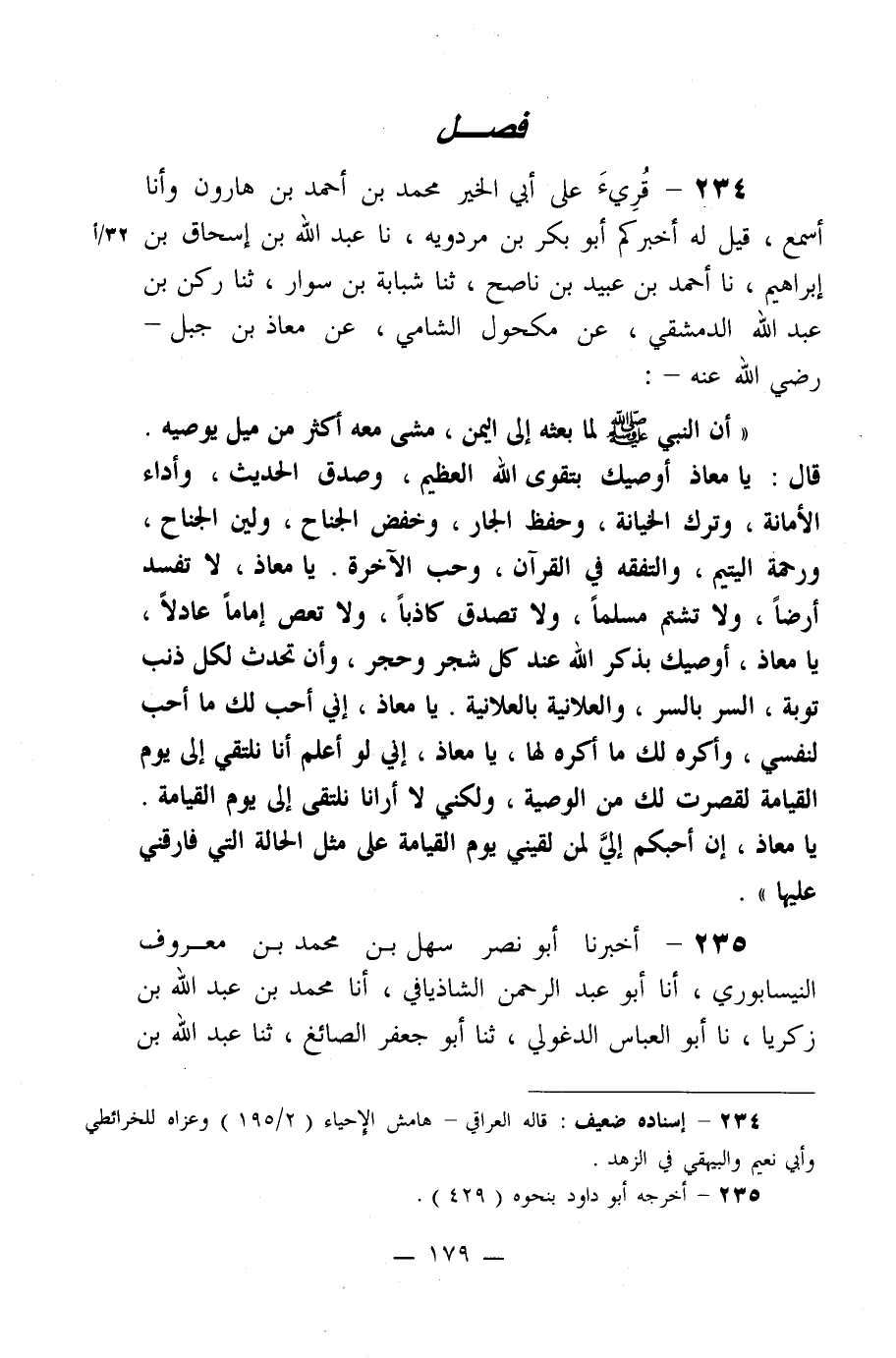 234- قريء على أبي الخير محمد بن أحمد بن هارون وأنا أسمع، قيل له: أخبركم أبو بكر بن مردويه، نا عبد الله بن إسحاق بن إبراهيم، نا أحمد بن عبيد بن ناصح، ثنا شبابة بن سوار، ثنا ركن بن عبد الله الدمشقي، عن مكحول الشامي، عن معاذ بن جبل –رضي الله عنه-: