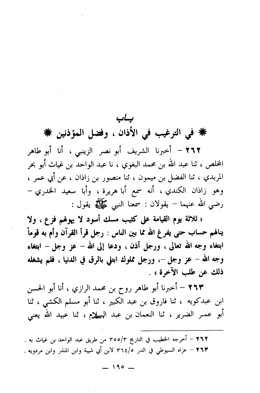 262- أخبرنا الشريف أبو نصر الزينبي، أنا أبو طاهر المخلص، ثنا عبد الله بن محمد البغوي، نا عبد الواحد بن غياث أبو بحر المربدي، ثنا الفضل بن ميمون، ثنا منصور بن زاذان، عن أبي عمر، وهو زاذان الكندي، أنه سمع أبا هريرة، وأبا سعيد الخدري -رضي الله عنهما- يقولان: سمعنا النبي صلى الله عليه وسلم يقول: