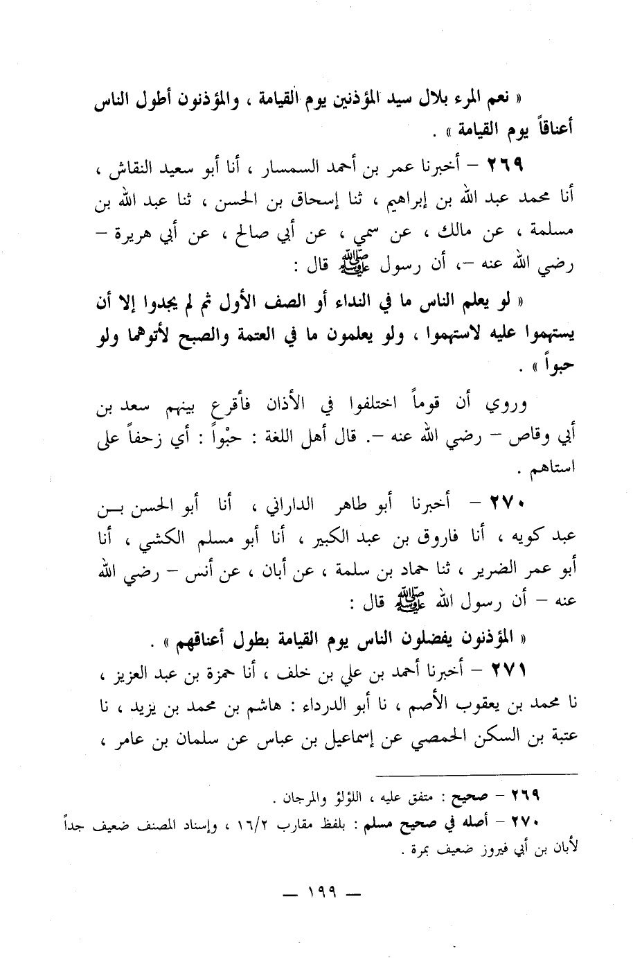 269- أخبرنا عمر بن أحمد السمسار، أنا أبو سعيد النقاش، أنا محمد عبد الله بن إبراهيم، ثنا إسحاق بن الحسن، ثنا عبد الله بن مسلمة، عن مالك، عن سمي، عن أبي صالح، عن أبي هريرة –رضي الله عنه-، أن رسول الله صلى الله عليه وسلم قال:
