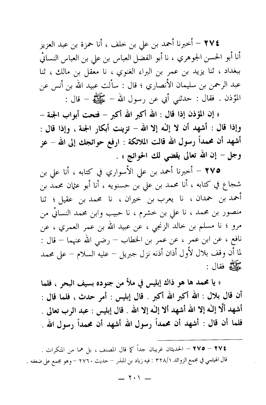 275- أخبرنا أحمد بن علي الأسواري في كتابه، أنا علي بن شجاع في كتابه، أنا محمد بن علي بن حسنويه، أنا أبو عثمان محمد بن أحمد بن حمدان، نا يعرب بن خيران، نا حبيب وابن محمد النسائي من مرو؛ نا مسلم بن خالد الزنجي، عن عبيد الله بن عمر العمري، عن نافع، عن ابن عمر، عن عمر بن الخطاب –رضي الله عنهما- قال: لما أن وقف بلال لأول أذان أذنه نزل جبري –عليه السلام- على محمد صلى الله عليه وسلم فقال: