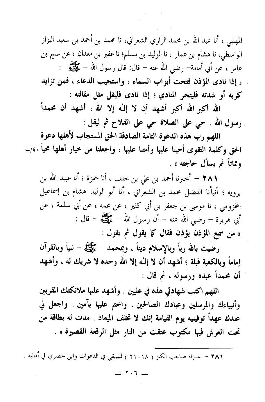 281- أخبرنا أحمد بن علي بن خلف، أنا حمزة؛ أنا عبد الله بن برويه؛ أنبأنا الفضل محمد بن الشعراني، أنا أبو الوليد هشام بن إسماعيل المخزومي، نا موسى بن جعفر بن أبي كثير، عن عمه، عن أبي سلمة، عن أبي هريرة –رضي الله عنه- أن رسول الله صلى الله عليه وسلم قال: