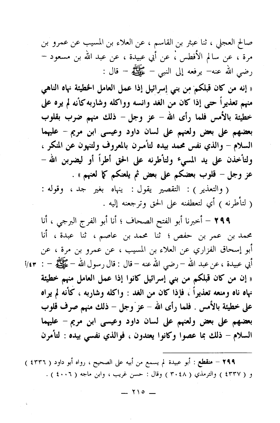((إن من كان قبلكم من بني إسرائيل كانوا إذا عمل العامل منهم خطيئة نهاه ناه ومنعه تعذيراً، فإذا كان من الغد: واكله وشاربه، كأنه لم يره على خطيئة بالأمس. فلما رأى الله –عز وجل- ذلك منهم صرف قلوب بعضهم على بعض ولعنهم على لسان داود وعيسى ابن مريم –عليهما السلام- ذلك بما عصوا وكانوا يعتدون، فوالذي نفسي بيده: لتأمرن -[216]- بالمعروف، ولتنهن عن المنكر ولتأخذن على يدي المسيء ولتأطرنه على الحق أطراً، أو ليضربن الله بقلوب بعضكم على بعض ثم يلعنكم كما لعنهم)) .