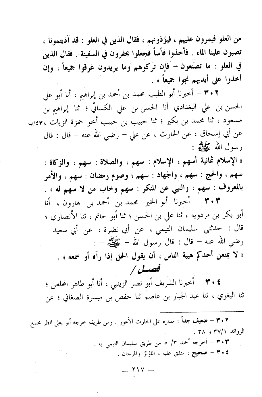 304- أخبرنا الشريف أبو نصر الزينبي، أنا أبو طاهر المخلص؛ ثنا البغوي، ثنا عبد الجبار بن عاصم ثنا حفص بن ميسرة الصنعاني؛ عن -[218]- زيد بن أسلم، عن عطاء بن يسار عن أبي سعيد الخدري –رضي الله عنه- عن النبي صلى الله عليه وسلم قال: