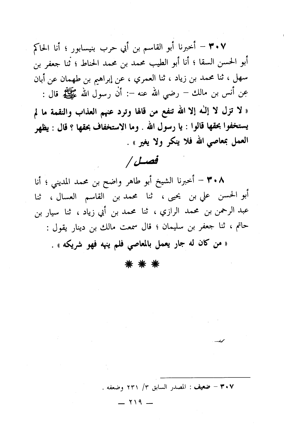 307- أخبرنا أبو القاسم بن أبي حرب بنيسابور؛ أنا الحاكم أبو الحسن السقا؛ أنا أبو الطيب محمد بن محمد الحناط؛ ثنا جعفر بن سهل، ثنا محمد بن زياد، ثنا العمري، عن إبراهيم بن طهمان عن أبان عن أنس بن مالك –رضي الله عنه-: أن رسول الله صلى الله عليه وسلم قال: