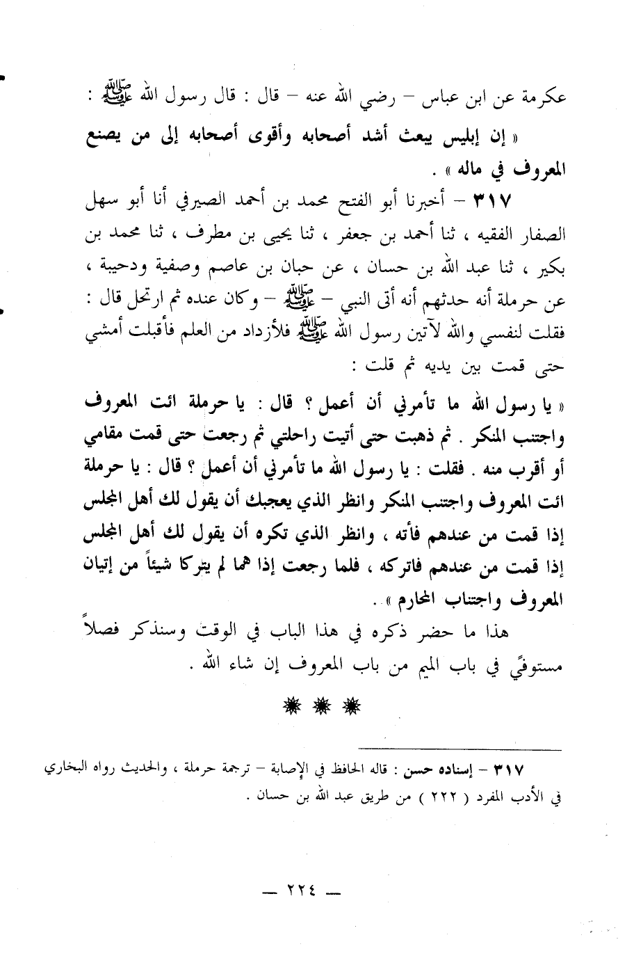 ((يا رسول الله ما تأمرني أن أعمل؟ قال: يا حرملة ائت المعروف واجتنب المنكر. ثم ذهبت حتى أتيت راحلتي ثم رجعت حتى قمت مقامي أو أقرب منه. فقلت: يا رسول الله ما تأمرني أن أعمل؟ قال: يا حرملة ائت المعروف واجتنب المنكر وانظر الذي يعجبك أن يقول لك أهل المجلس إذا قمت من عندهم فأته، وانظر الذي تكره أن يقول لك أهل المجلس إذا قمت من عندهم فاتركه، فلما رجعت إذا هما لم يتركا شيئاً من إتيان المعروف واجتناب المحارم)) .