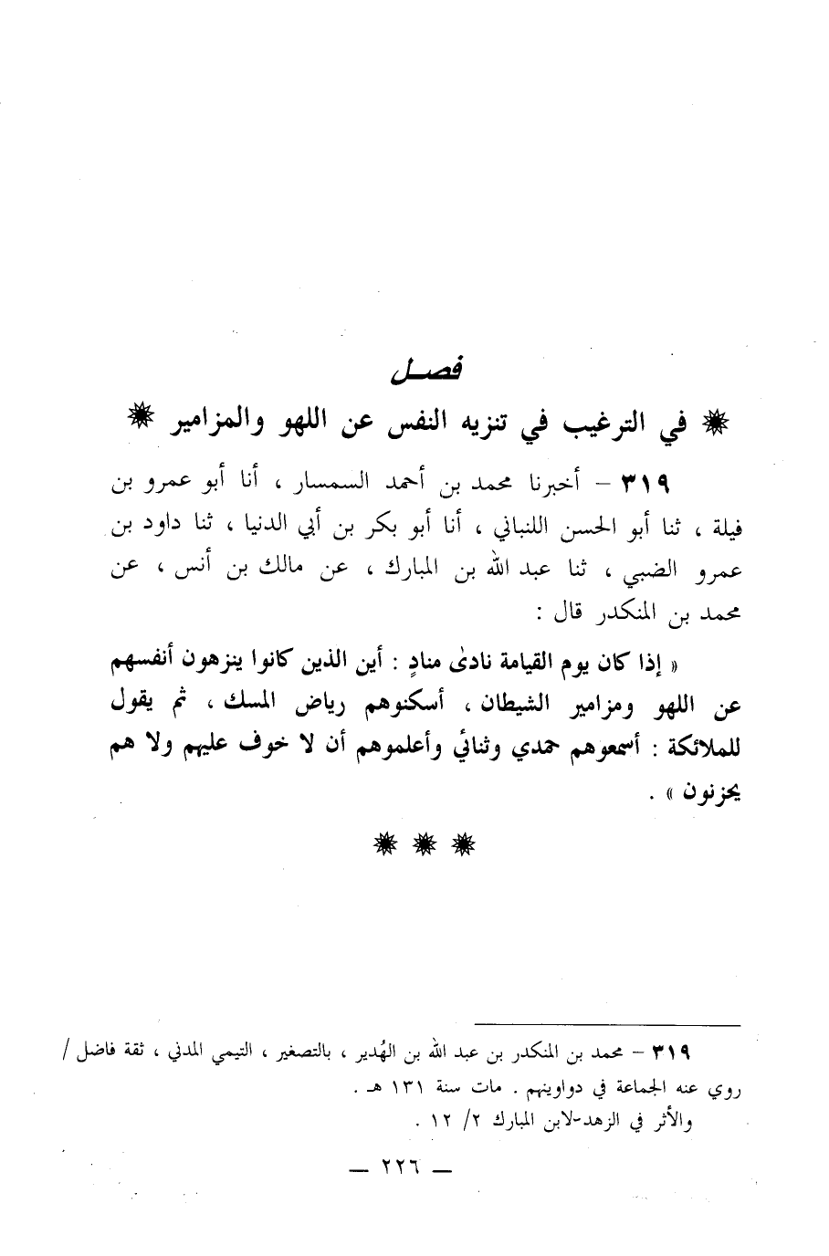 319- أخبرنا محمد بن أحمد السمسار، أنا أبو عمرو بن فيلة، ثنا أبو الحسن اللنباني، أنا أبو بكر بن أبي الدنيا، ثنا داود بن عمرو الضبي، ثنا عبد الله بن المبارك، عن مالك بن أنس، عن محمد بن المنكدر قال: