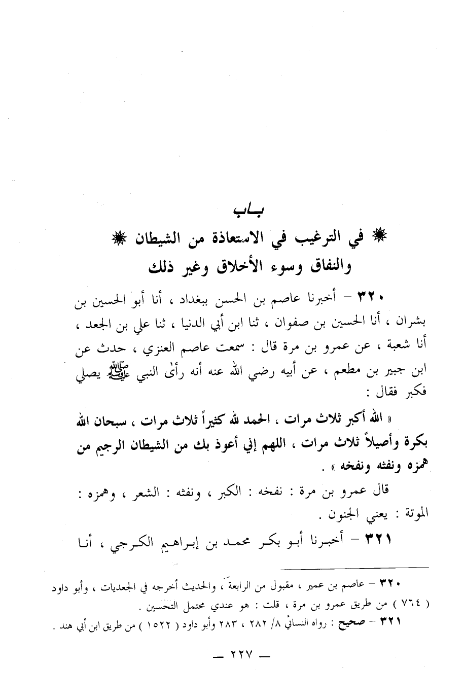 ((الله أكبر ثلاث مرات، الحمد لله كثيراً ثلاث مرات، سبحان الله بكرة وأصيلاً ثلاث مرات، اللهم إني أعوذ بك من الشيطان الرجيم من همزة ونفثه ونفخه)) .