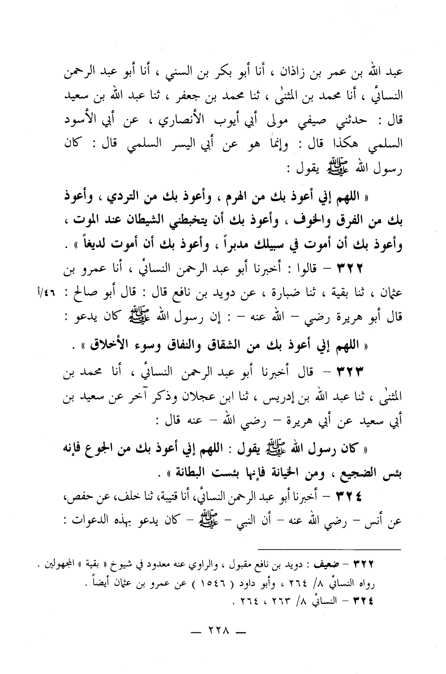 322- قالوا: أخبرنا أبو عبد الرحمن النسائي، أنا عمرو بن عثمان، ثنا بقية، ثنا ضبارة، عن دويد بن نافع قال: قال أبو صالح: قال أبو هريرة –رضي الله عنه-: إن رسول الله صلى الله عليه وسلم كان يدعو: