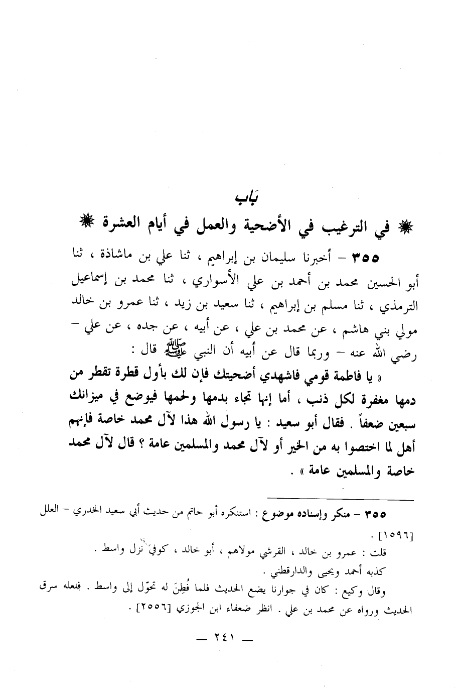 ((يا فاطمة قومي فاشهدي أضحيتك فإن لك بأول قطرة تقطر من دمها مغفرة لكل ذنب، أما إنها تجاء بدمها ولحمها فيوضع في ميزانك سبعين ضعفاً. فقال أبو سعيد: يا رسول الله هذا لآل محمد خاصة فإنهم أهل لما اختصوا به من الخير أو لآل محمد والمسلمين عامة؟ قال: لآل محمد خاصة والمسلمين عامة)) .