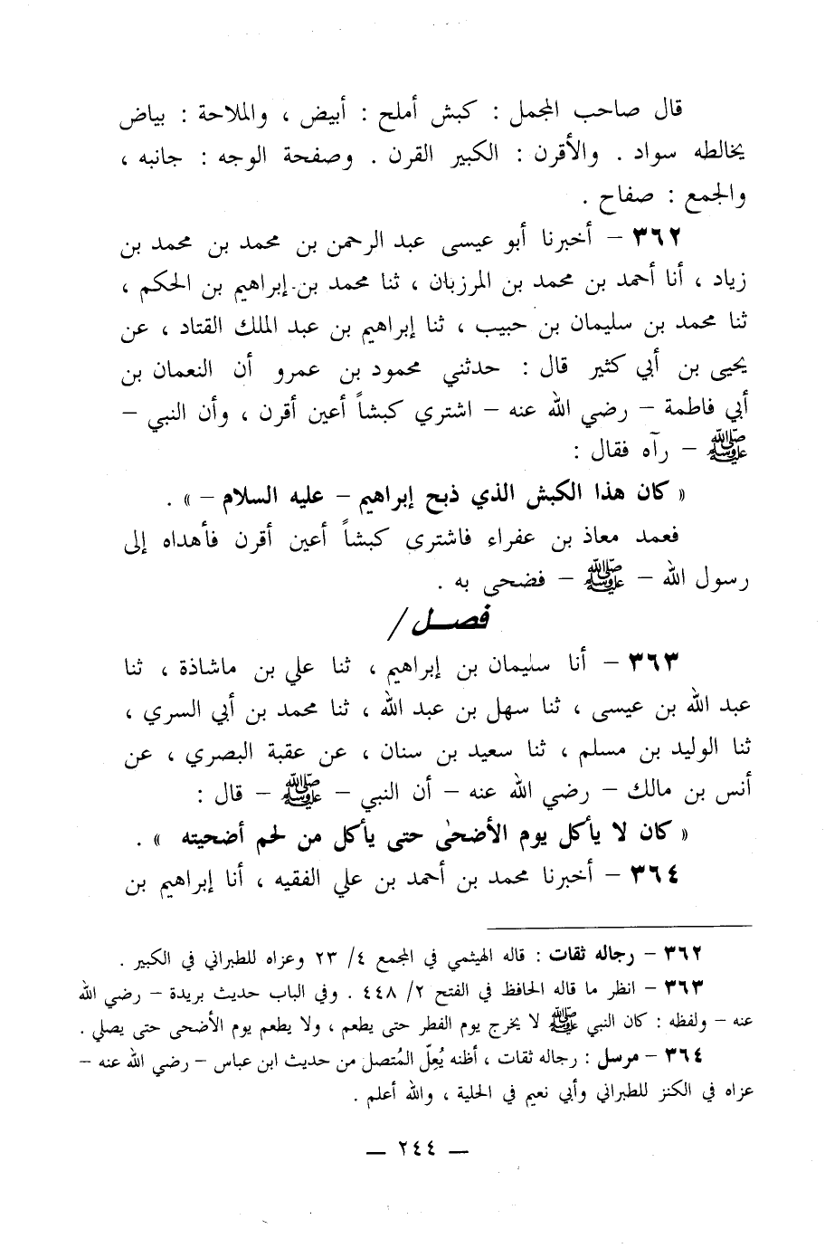 362- أخبرنا أبو عيسى عبد الرحمن بن محمد بن محمد بن زياد، أنا أحمد بن محمد بن المرزبان، ثنا محمد بن إبراهيم بن الحكم، ثنا محمد بن سليمان بن حبيب، ثنا إبراهيم بن عبد الملك القناد، عن يحيى بن أبي كثير قال: حدثني محمود بن عمرو أن النعمان بن أبي فاطمة –رضي الله عنه- اشترى كبشاً أعين أقرن، وأن النبي صلى الله عليه وسلم رآه فقال: