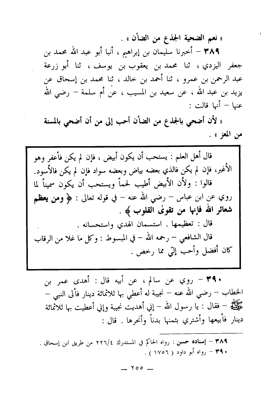 390- روي عن سالم، عن أبيه قال: أهدى عمر بن الخطاب -رضي الله عنه- نجيبة له أعطي بها ثلاثمائة دينار فأتى النبي صلى الله عليه وسلم فقال: يا رسول الله - إني أهديت نجيبة وإني أعطيت بها ثلاثمائة دينار فأبيعها وأشتري بثمنها بدناً وأنحرها. قال: