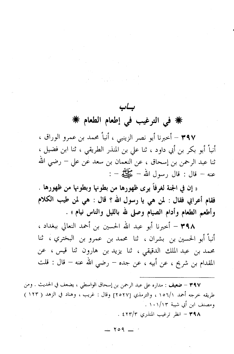 398- أخبرنا أبو عبد الله الحسين بن أحمد النعالي ببغداد، أنبأ أبو الحسين بن بشران، ثنا محمد بن عمرو بن البختري، ثنا محمد بن عبد الملك الدقيقي، ثنا يزيد بن هارون ثنا قيس، عن المقدام بن شريح، عن أبيه، عن جده –رضي الله عنه- قال: قلت -[260]- يا رسول الله: دلني على ما يوجب الجنة؟ قال: