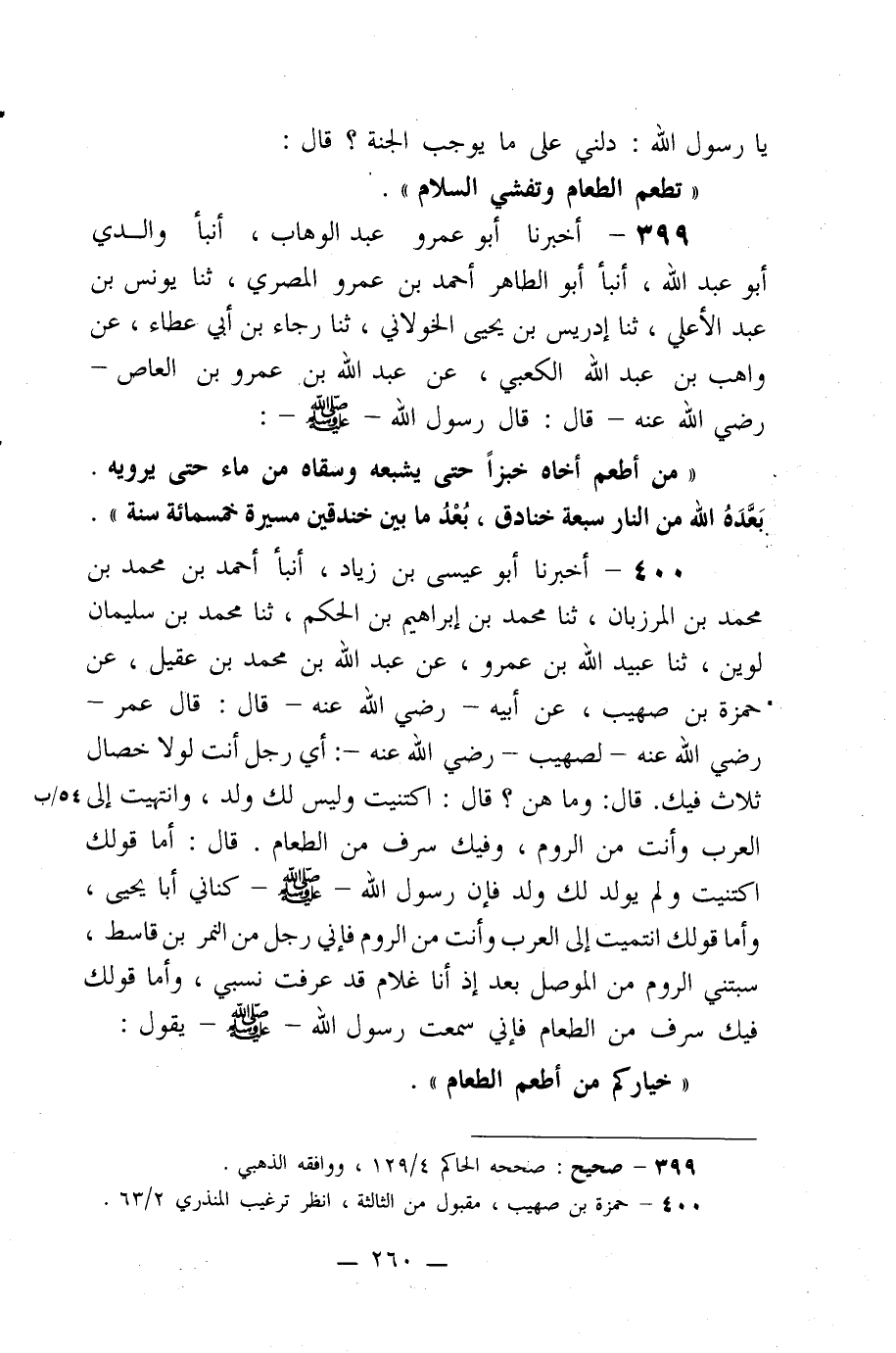 399- أخبرنا أبو عمرو عبد الوهاب، أنبأ والدي أبو عبد الله، أنبأ أبو الطاهر أحمد بن عمرو المصري، ثنا يونس بن عبد الأعلى، ثنا إدريس بن يحيى الخولاني، ثنا رجاء بن أبي عطاء، عن واهب بن عبد الله الكعبي، عن عبد الله بن عمرو بن العاص –رضي الله عنه- قال: قال رسول الله صلى الله عليه وسلم: