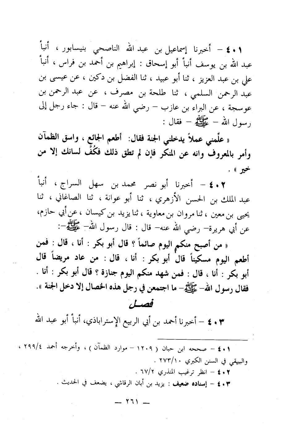 401- أخبرنا إسماعيل بن عبد الله الناصحي بنيسابور، أنبأ عبد الله بن يوسف أنبأ أبو إسحاق: إبراهيم بن أحمد بن فراس، أنبأ علي بن عبد العزيز، ثنا أبو عبيد، ثنا الفضل بن دكين، عن عيسى بن عبد الرحمن السلمي، ثنا طلحة بن مصرف، عن عبد الرحمن بن عوسجة، عن البراء بن عازب –رضي الله عنه- قال: جاء رجل إلى رسول الله صلى الله عليه وسلم فقال: