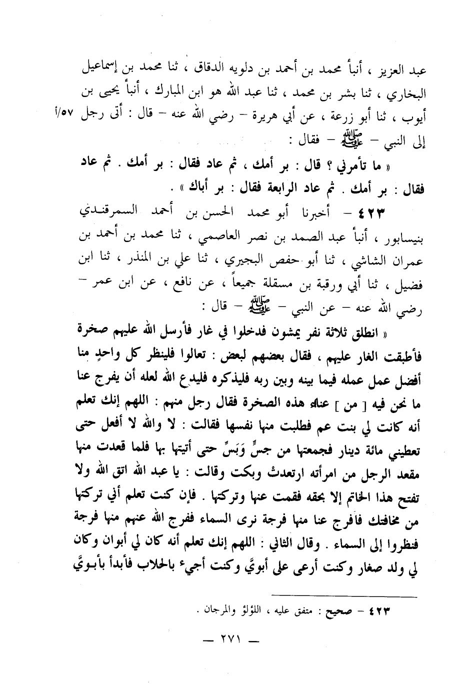 ((انطلق ثلاثة نفر يمشون فدخلوا في غار فأرسل الله عليهم صخرة فأطبقت الغار عليهم، فقال بعضهم لبعض: تعالوا فلينظر كل واحد منا أفضل عمل عمله فيما بينه وبين ربه فليذكره فليدع الله لعله أن يفرج عنا ما نحن فيه [من] عناء هذه الصخرة فقال رجل منهم: اللهم إنك تعلم أنه كانت لي بنت عم فطلبت منها نفسها فقالت: لا والله لا أفعل حتى تعطيني مائة دينار فجمعتها من جسٍّ وبسٍّ حتى أتيتها بها فلما قعدت منها مقعد الرجل من امرأته ارتعدت وبكت وقالت: يا عبد الله اتق الله ولا تفتح هذا الخاتم إلا بحقه فقمت عنها وتركتها. فإن كنت تعلم أني تركتها من مخافتك فافرج عنا منها فرجة نرى السماء ففرج الله عنهم منها فرجة فنظروا إلى السماء. وقال الثاني: اللهم إنك تعلم أنه كان لي أبوان وكان لي ولد صغار وكنت أرعى على أبوي وكنت أجيء بالحلاب فأبدأ بأبوي -[272]- فأسقيهما ثم أجيء بفضله إلى ولدي وإني جئت ليلة بالحلاب فوجدت أبوي نائمين والصبيان يتضاغون من الجوع فلم أزل بهم حتى ناموا ثم قمت بالحلاب عليهما حتى قاما فشربا، ثم انطلقت إلى الصبية بفضله فسقيتهم. فإن كنت تعلم أني صنعت ذلك من مخافتك فافرج عنا منها فرجة قال: ففرج الله عنهم منها فرجة.