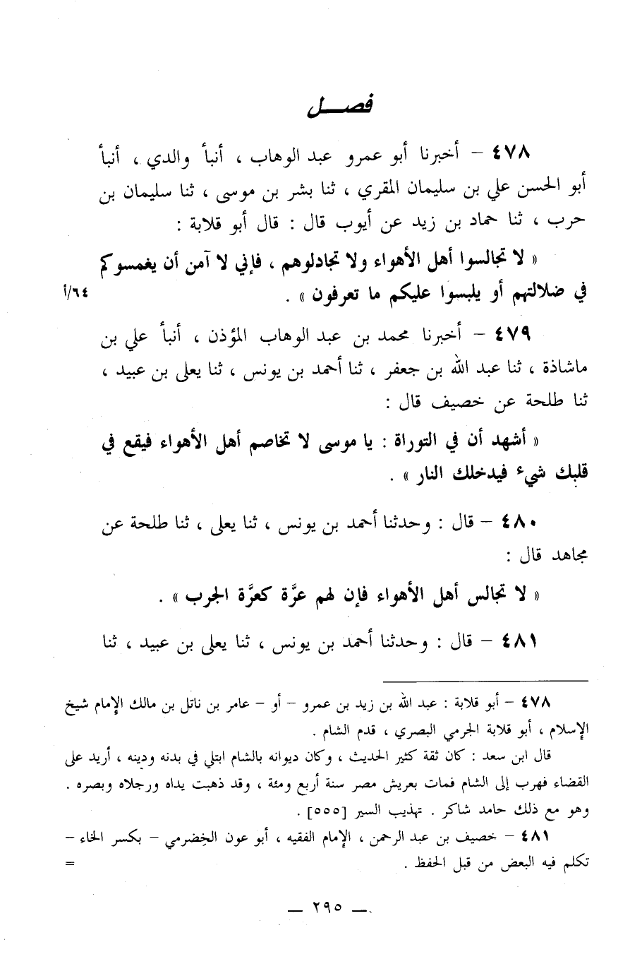 478- أخبرنا أبو عمرو عبد الوهاب، أنبأ والدي، أنبأ أبو الحسن علي بن سليمان المقري، ثنا بشر بن موسى، ثنا سليمان بن حرب، ثنا حماد بن زيد عن أيوب قال: قال أبو قلابة:
