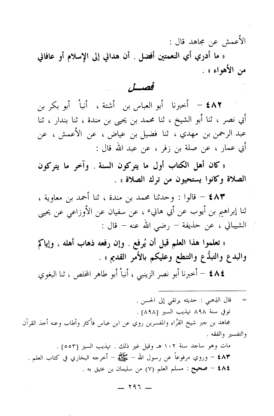 482- أخبرنا أبو العباس بن أشتة، أنبأ أبو بكر بن أبي نصر، ثنا أبو الشيخ، ثنا محمد بن يحيى بن مندة، ثنا بندار، ثنا عبد الرحمن بن مهدي، ثنا فضيل بن عياض، عن الأعمش، عن أبي عمار، عن صلة بن زفر، عن عبد الله قال: