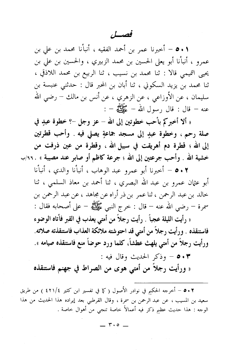 501- أخبرنا عمر بن أحمد الفقيه، أنبأنا محمد بن علي بن عمرو، أنبأنا أبو يعلى الحسين بن محمد الزبيري، والحسين بن علي بن يحيى التميمي قالا: ثنا محمد بن نسيب، ثنا الربيع بن محمد اللاذقي، ثنا محمد بن يزيد السكوني، ثنا أبان بن المحبر قال: حدثني عنبسة بن سليمان، عن الأوزاعي، عن الزهري، عن أنس بن مالك –رضي الله عنه- قال: قال رسول الله صلى الله عليه وسلم: