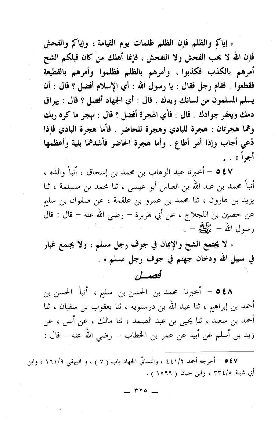 547- أخبرنا عبد الوهاب بن محمد بن إسحاق، أنبأ والده، أنبأ محمد بن عبد الله بن العباس أبو عيسى، ثنا محمد بن مسيلمة، ثنا يزيد بن هارون، ثنا محمد بن عمرو بن علقمة، عن صفوان بن سليم عن حصين بن اللجلاج، عن أبي هريرة -رضي الله عنه- قال: قال رسول الله صلى الله عليه وسلم: