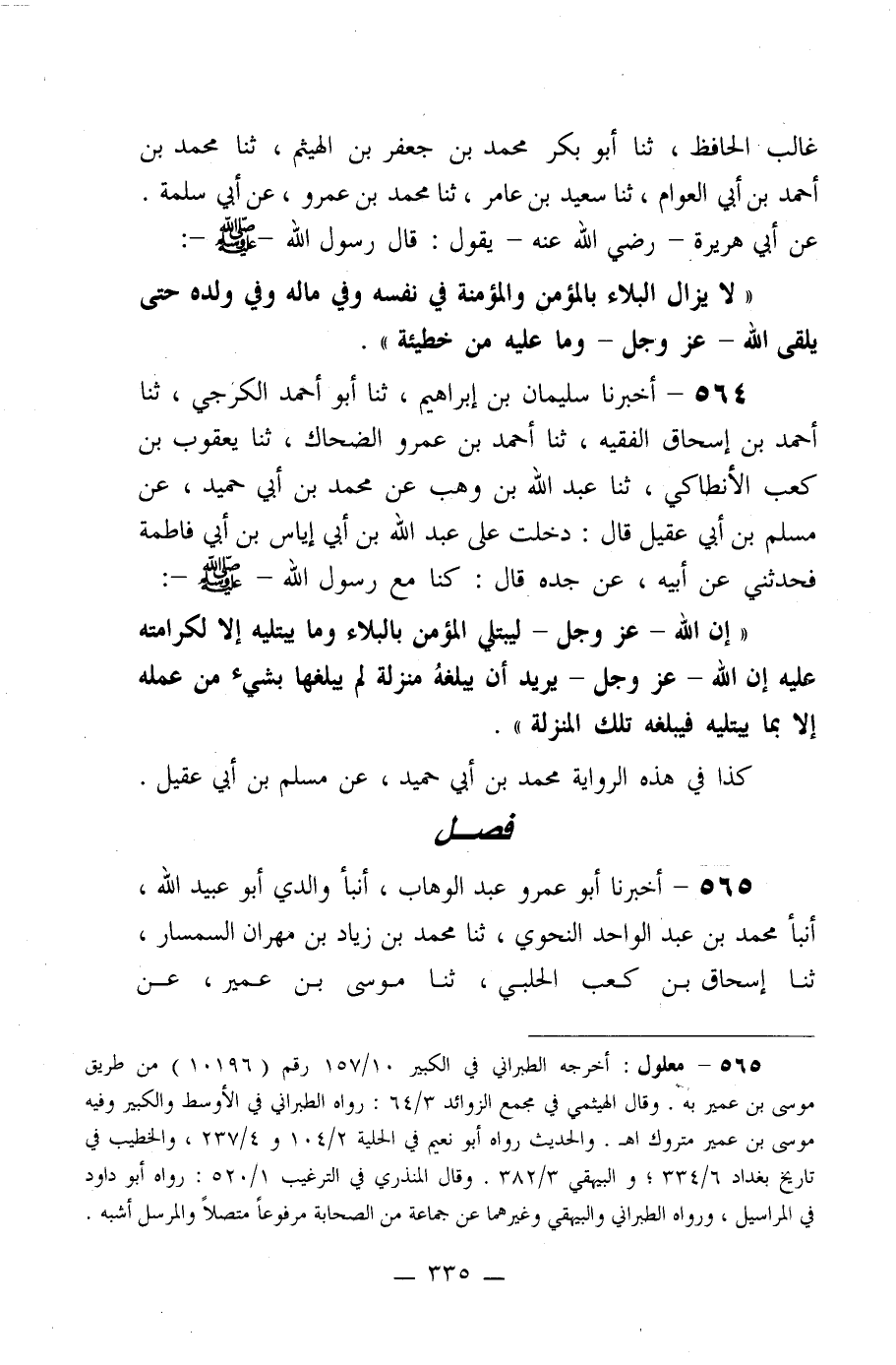 565- أخبرنا أبو عمرو عبد الوهاب، أنبأ والدي أبو عبد الله، أنبأ محمد بن عبد الواحد النحوي، ثنا محمد بن زياد بن مهران السمسار، ثنا إسحاق بن كعب الحلبي، ثنا موسى بن عمير، عن -[336]- الحكم بن عتيبة، عن إبراهيم، عن الأسود، عن عبد الله –رضي الله عنه- قال: قال رسول الله صلى الله عليه وسلم: