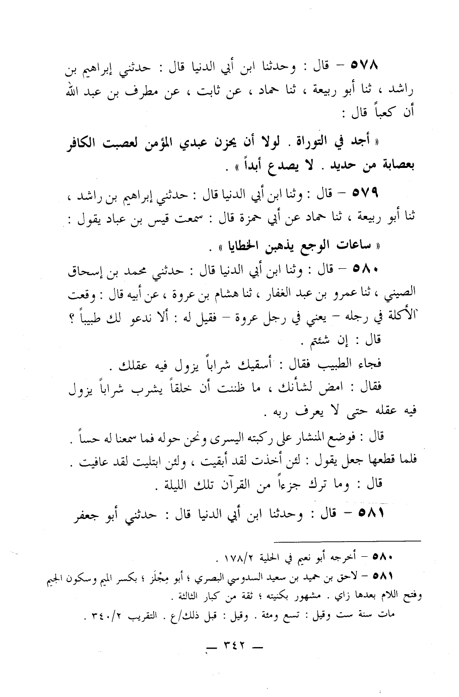 578- قال: وحدثنا ابن أبي الدنيا قال: حدثني إبراهيم بن راشد، ثنا أبو ربيعة، ثنا حماد، عن ثابت، عن مطرف بن عبد الله أن كعباً قال:
