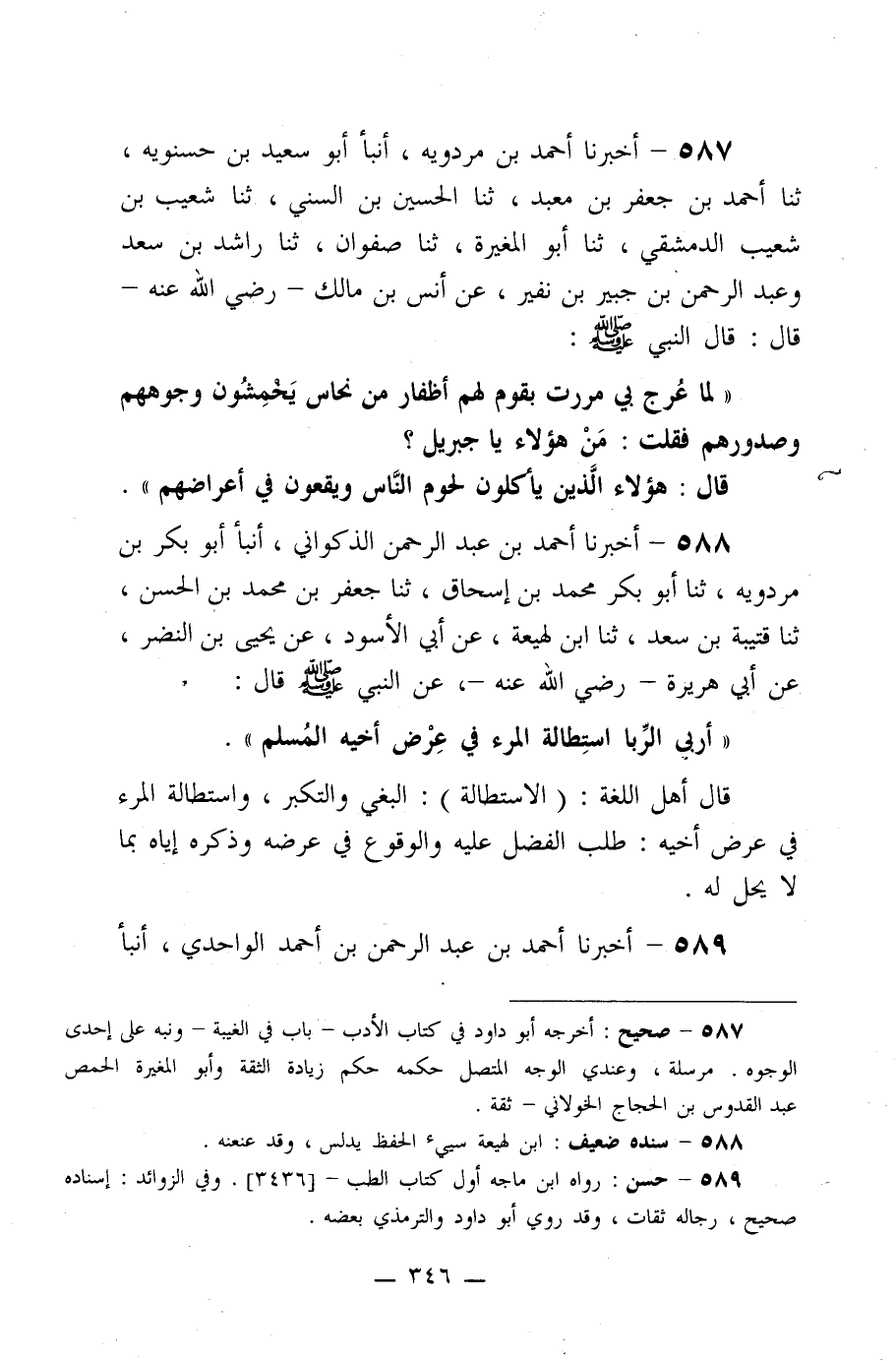 587- أخبرنا أحمد بن مردويه، أنبأ أبو سعيد بن حسنويه، ثنا أحمد بن جعفر بن معبد، ثنا الحسين بن السني، ثنا شعيب بن شعيب الدمشقي، ثنا أبو المغيرة، ثنا صفوان، ثنا راشد بن سعد وعبد الرحمن بن جبير بن نفير، عن أنس بن مالك –رضي الله عنه- قال: قال النبي صلى الله عليه وسلم:
