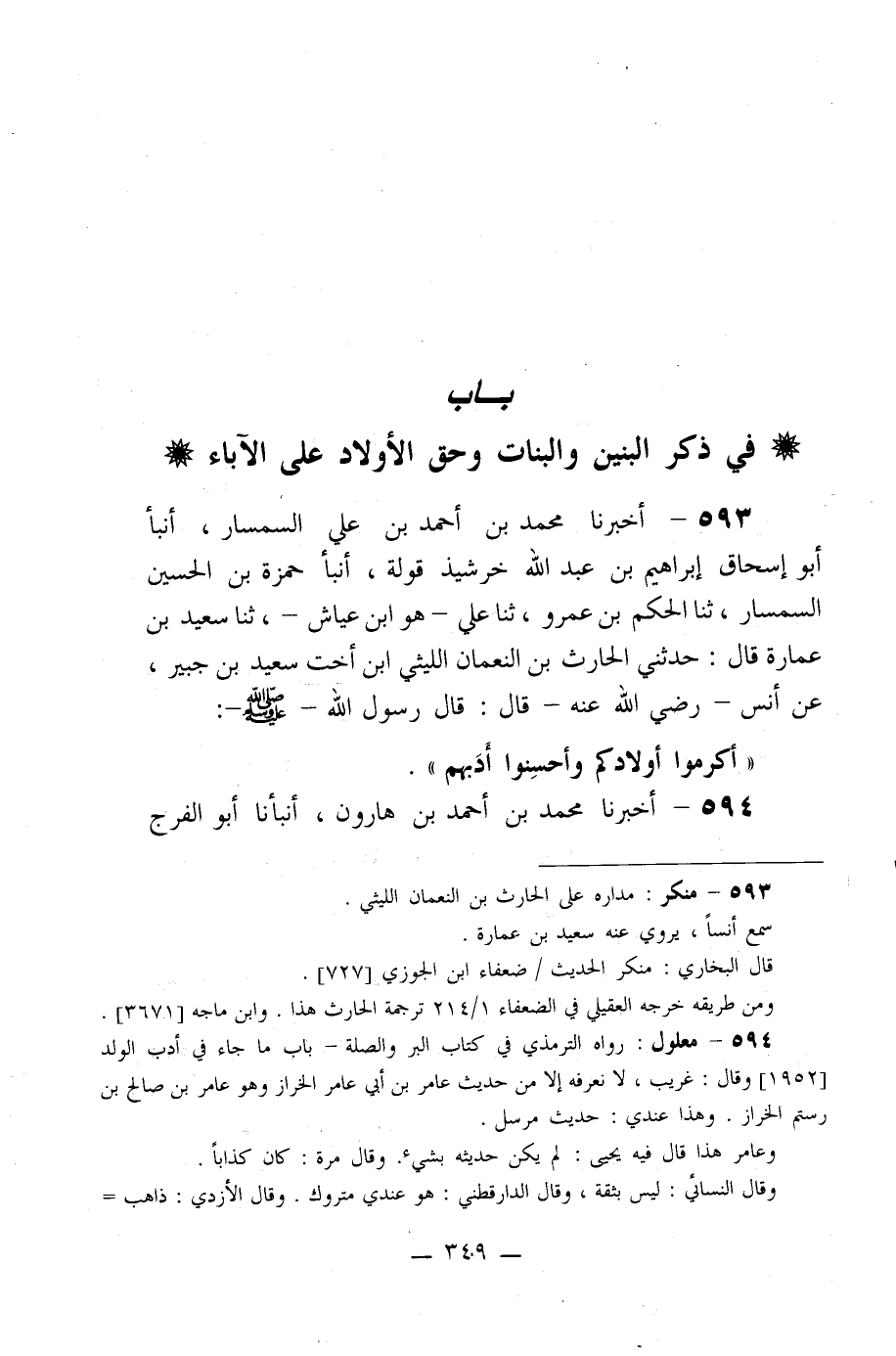 593- أخبرنا محمد بن أحمد بن علي السمسار، أنبأ أبو إسحاق إبراهيم بن عبد الله خرشيذ قولة، أنبأ حمزة بن الحسين السمسار، ثنا الحكم بن عمرو، ثنا علي –هو ابن عياش-، ثنا سعيد بن عمارة قال: حدثني الحارث بن النعمان الليثي ابن أخت سعيد بن جبير، عن أنس –رضي الله عنه- قال: قال رسول الله صلى الله عليه وسلم:
