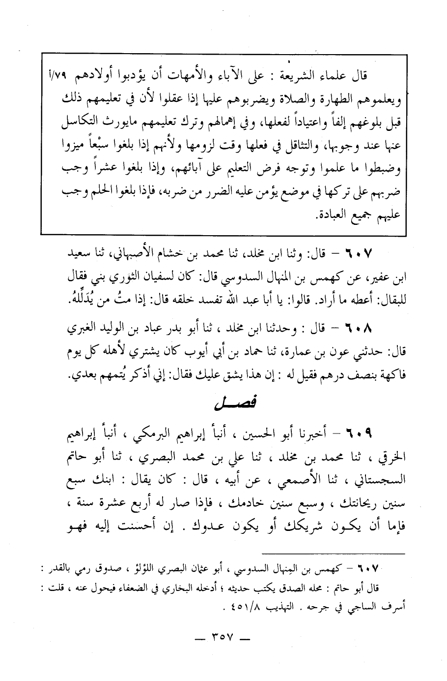 607- قال: وثنا ابن مخلد، ثنا محمد بن خشام الأصبهاني، ثنا سعيد ابن عفير، عن كهمس بن المنهال السدوسي قال: كان لسفيان الثوري بني فقال للبقال: أعطه ما أراد. قالوا: يا أبا عبد الله تفسد خلقه قال: إذا مت من يُدَلِّله.