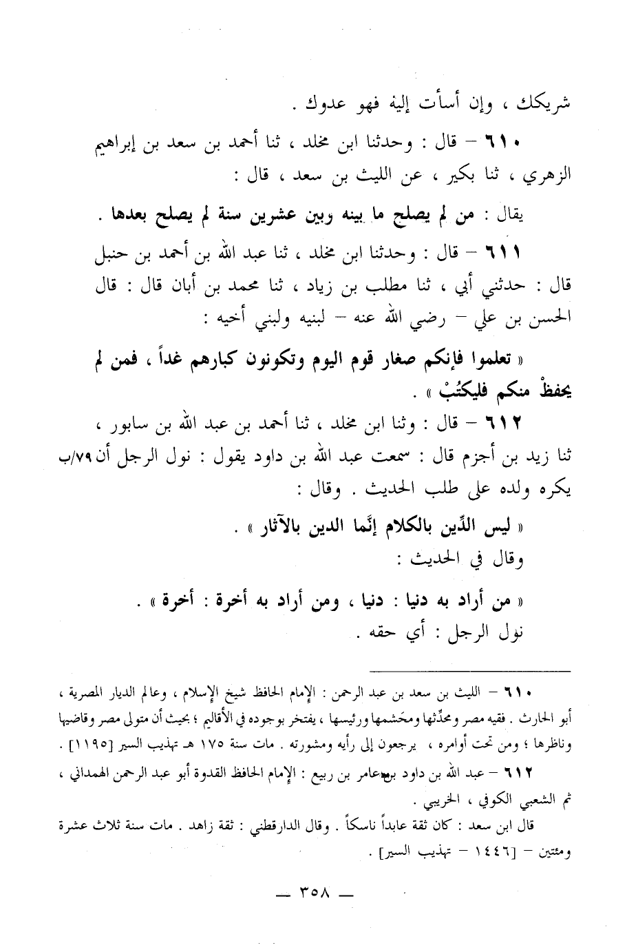 610- قال: وحدثنا ابن مخلد، ثنا أحمد بن سعد بن إبراهيم الزهري، ثنا بكير، عن الليث بن سعد، قال: