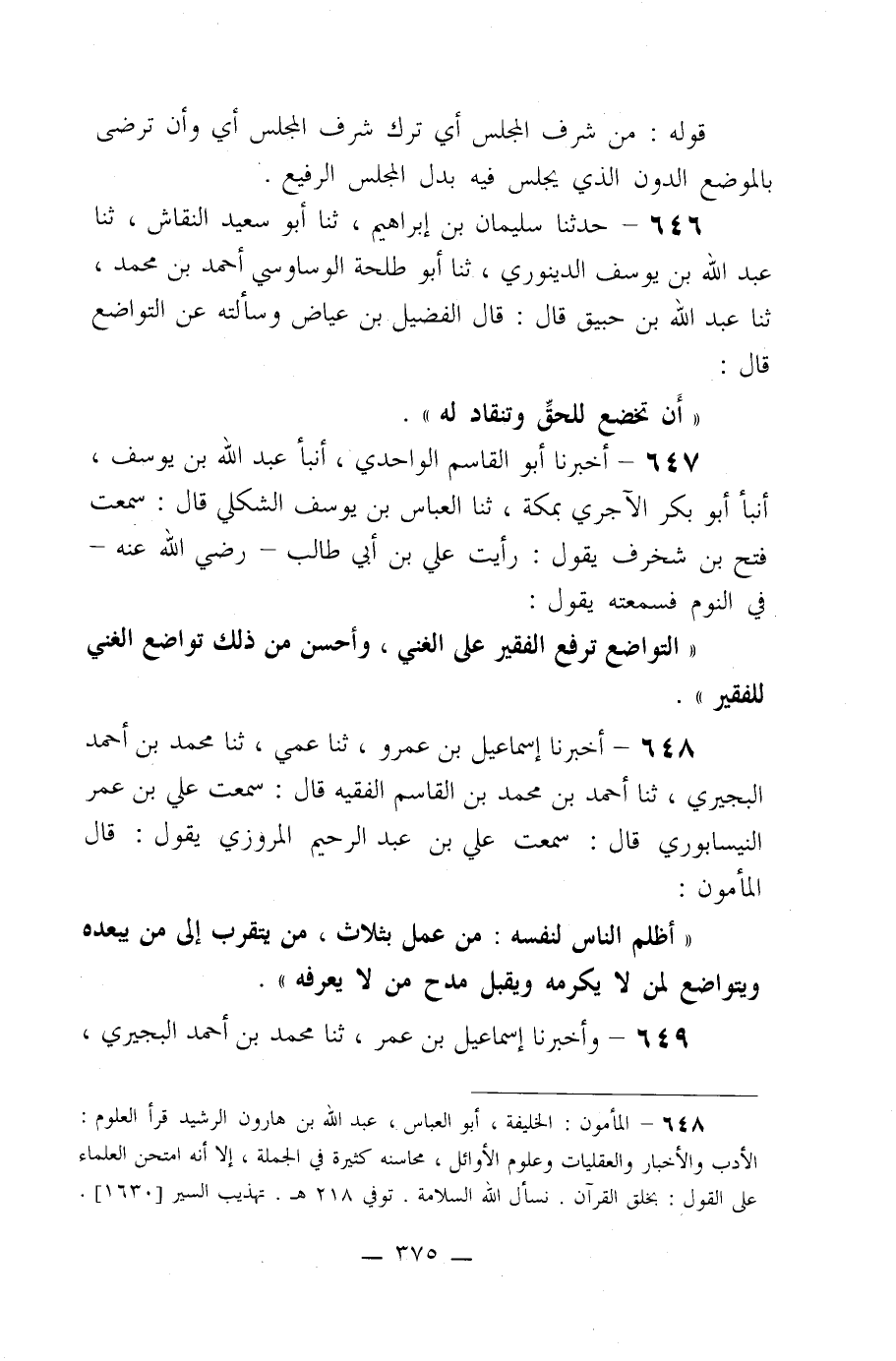 646- حدثنا سليمان بن إبراهيم، ثنا أبو سعيد النقاش، ثنا عبد الله بن يوسف الدينوري، ثنا أبو طلحة الوساوسي أحمد بن محمد، ثنا عبد الله بن حبيق قال: قال الفضيل بن عياض وسألته عن التواضع قال: