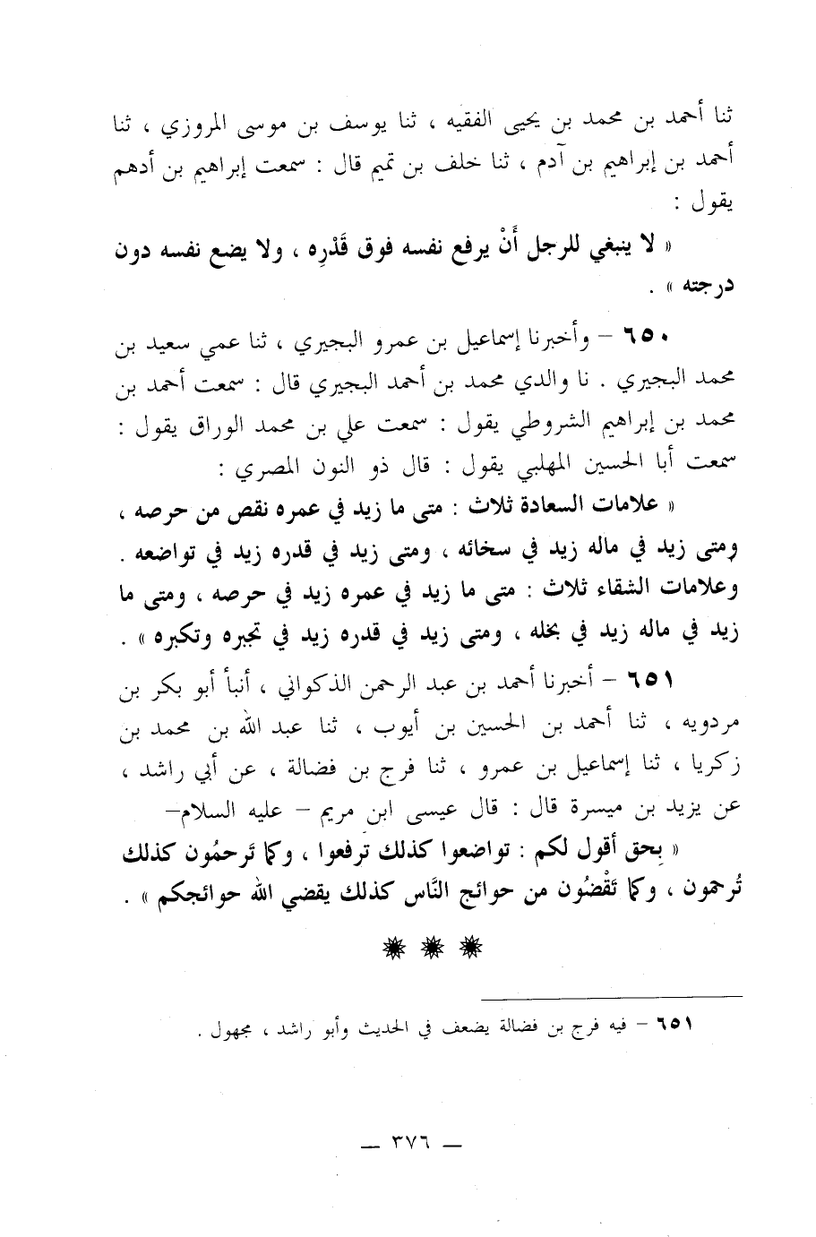 651- أخبرنا أحمد بن عبد الرحمن الذكواني، أنبأ أبو بكر بن مردويه، ثنا أحمد بن الحسين بن أيوب، ثنا عبد الله بن محمد بن زكريا، ثنا إسماعيل بن عمرو، ثنا فرج بن فضالة، عن أبي راشد، عن يزيد بن ميسرة قال: قال عيسى ابن مريم –عليه السلام-