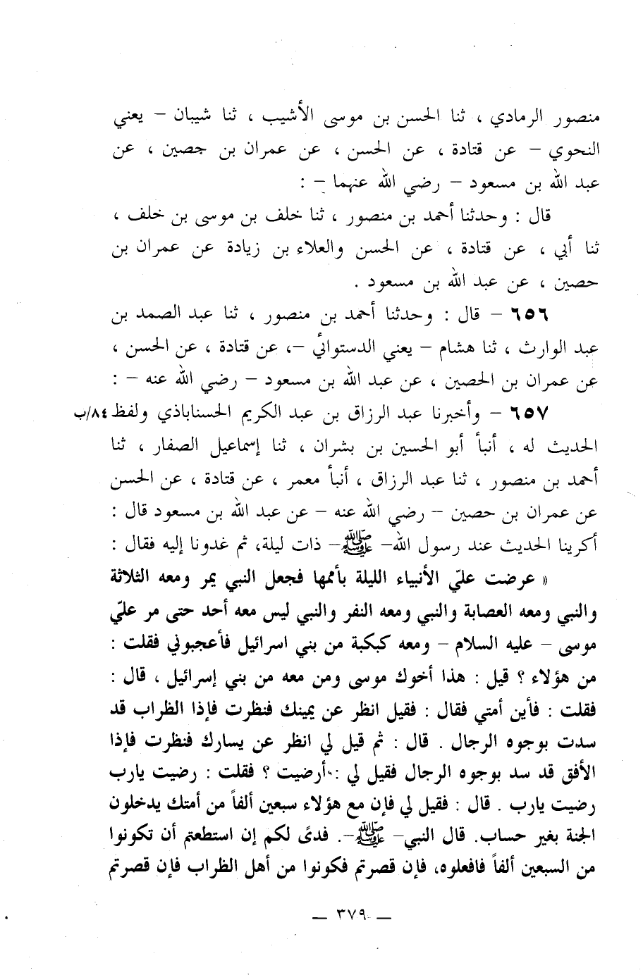 656- قال: وحدثنا أحمد بن منصور، ثنا عبد الصمد بن عبد الوارث، ثنا هشام –يعني الدستوائي-، عن قتادة، عن الحسن، عن عمران بن الحصين، عن عبد الله بن مسعود –رضي الله عنه-: