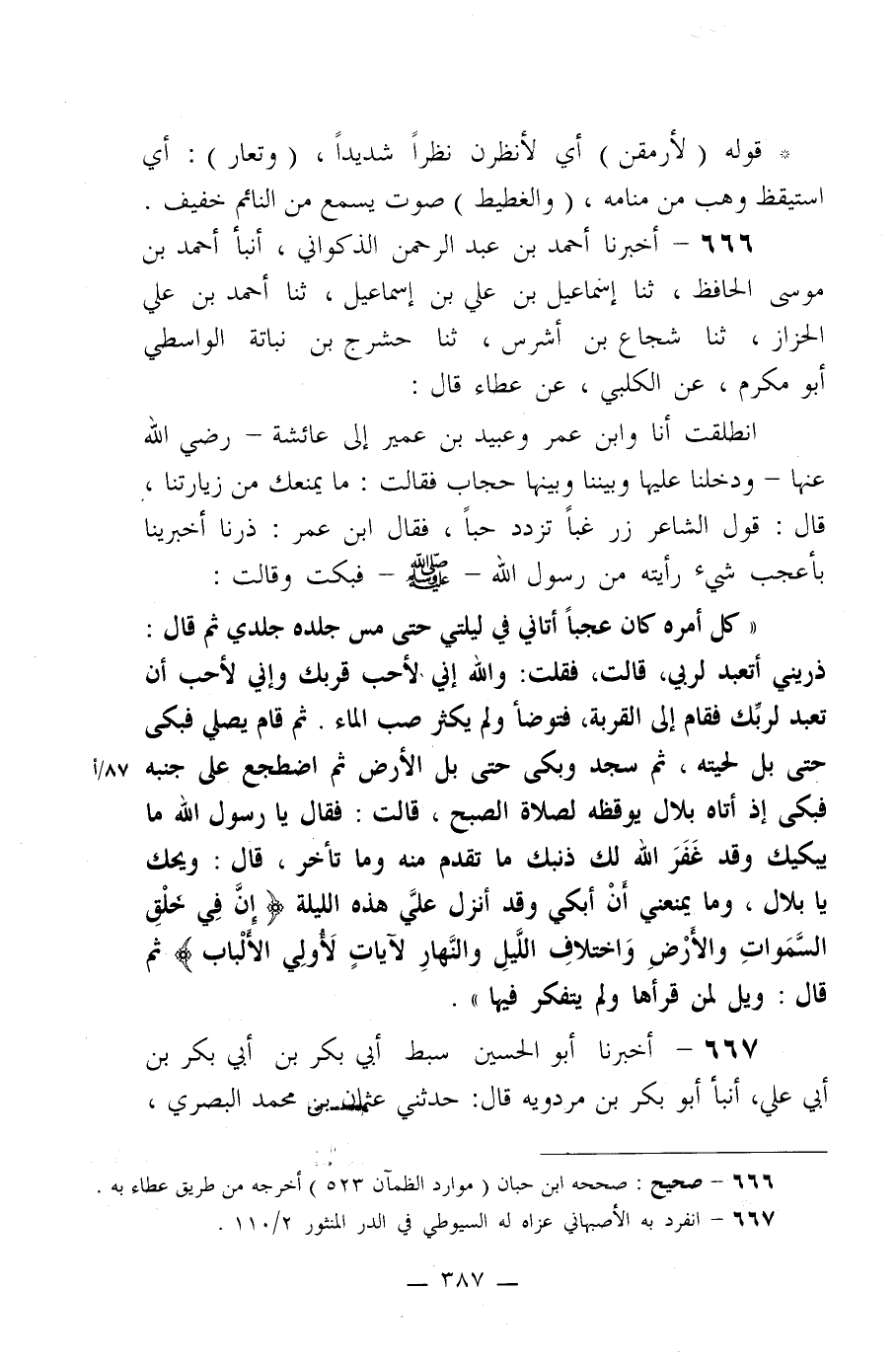 ((كل أمره كان عجباً أتاني في ليلتي حتى مس جلده جلدي ثم قال: ذريني أتعبد لربي، قالت: فقلت: والله إني لأحب قربك وإني لأحب أن تعبد لربك فقام إلى القربة، فتوضأ ولم يكثر صب الماء. ثم قام يصلي فبكي حتى بل لحيته، ثم سجد وبكى حتى بل الأرض ثم اضطجع على جنبه فبكي إذ أتاه بلال يوقظه لصلاة الصبح، قالت: فقال: يا رسول الله ما يبكيك وقد غفر الله لك ذنبك ما تقدم منه وما تأخر، قال: ويحك يا بلال، وما يمنعني أن أبكي وقد أنزل علي هذه الليلة: {إن في خلق السموات والأرض واختلاف الليل والنهار لآيات لأولي الألباب} ثم قال: ويل لمن قرأها ولم يتفكر فيها)) .