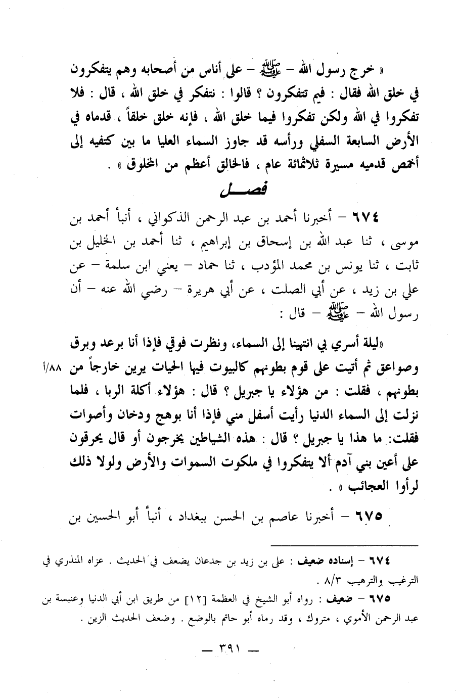 ((ليلة أسري بي انتهينا إلى السماء، ونظرت فوقي فإذا أنا برعد وبرق وصواعق ثم أتيت على قوم بطونهم كالبيوت فيها الحيات يرين خارجاً من بطونهم، فقلت: من هؤلاء يا جبريل؟ قال: هؤلاء أكلة الربا، فلما نزلت إلى السماء الدنيا رأيت أسفل مني فإذا أنا بوهج ودخان وأصوات فقلت: ما هذا يا جبريل؟ قال: هذه الشياطين يخرجون أو قال: يحرقون على أعين بني آدم ألا يتفكروا في ملكوت السموات والأرض ولولا ذلك لرأوا العجائب)) .