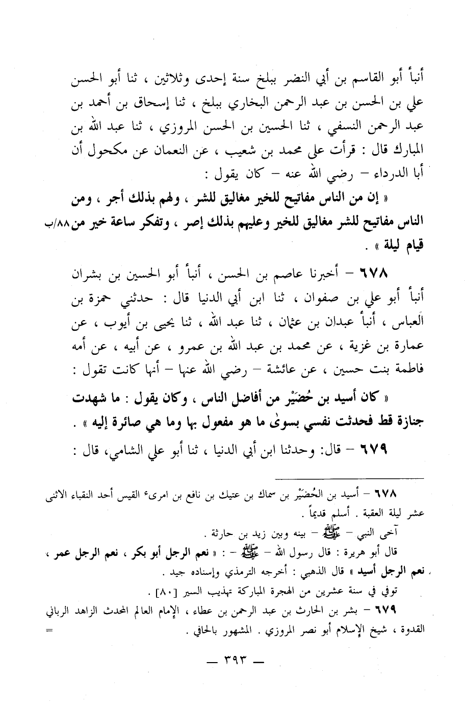 ((كان أسيد بن حضير من أفاضل الناس، وكان يقول: ما شهدت جنازة قط فحدثت نفسي بسوى ما هو مفعول بها وما هي صائرة إليه)) .